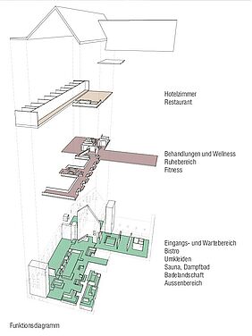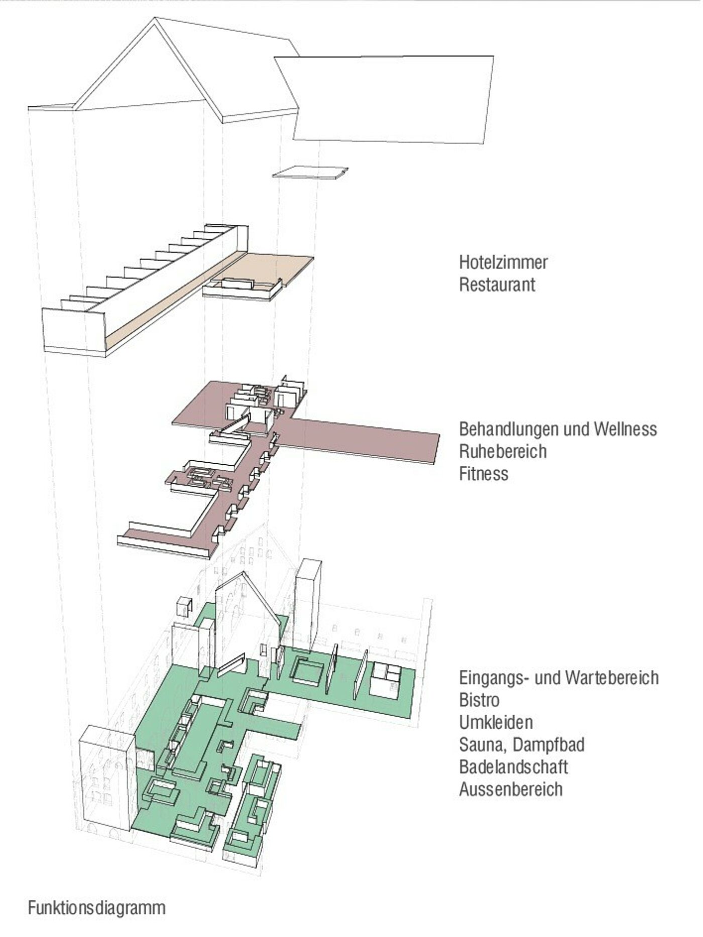 Für das ehemalige Wirtschaftsgebäude des Klosterareals wurde ein neues, dem Ort angemessenes Konzept entwickelt: Ein Thermalbad-Hotel.