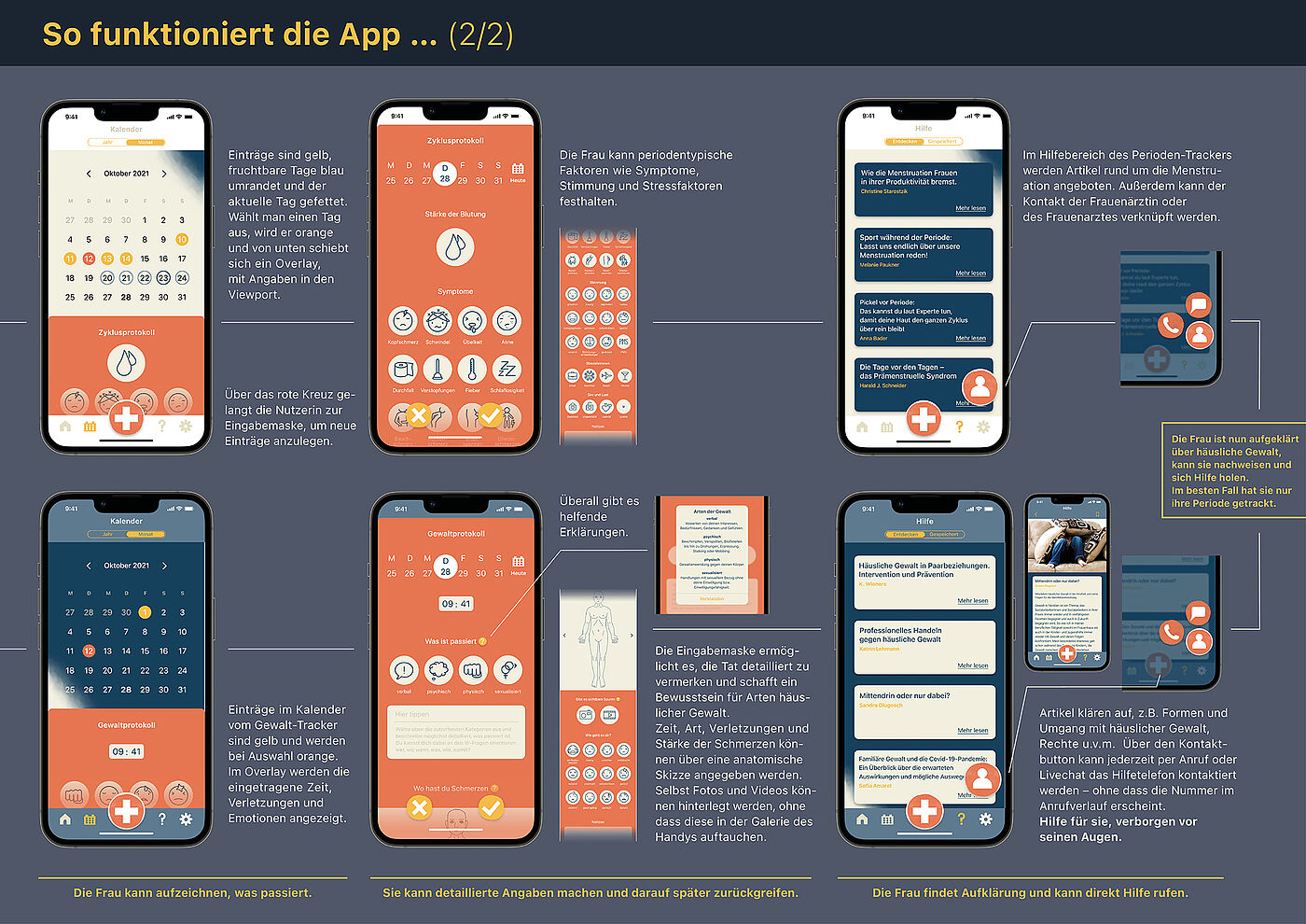 Der schlaue Gedanke war, dass sich Männer nicht Frauenthemen interessieren, insbesondere nicht für die Periode. Aber viele Frauen nutzen einen Perioden-Tracker. Und genau da haben Celine van der Veen und Isabelle Riedel angesetzt. Getarnte Hilfe in Form eines normalen Perioden-Trackers, der auch ein Gewalt-Tracker ist. Für ihn unsichtbar. Für sie die perfekte Hilfe.