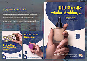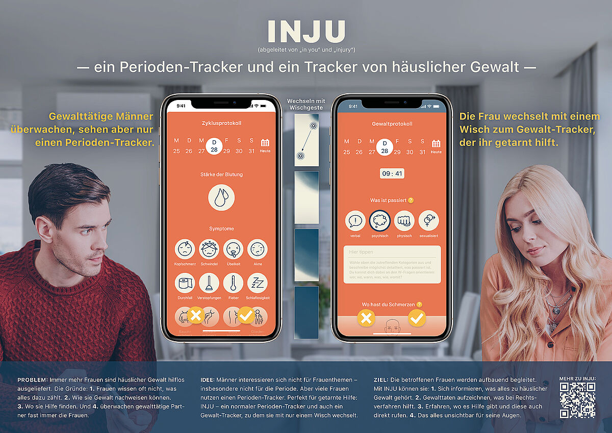 Über alle Aspekte wurde sich viele schlaue Gedanken gemacht. Angefangen beim Namen ‚INJU‘ abgeleitet aus „in you“ und „injury“ oder dem zugrundeliegenden Design, das abstrahiert die Farben und Formen von Blessuren aufgreift und gleichzeitig durch den Aquarell-Look sensibel damit umgeht. Die App selbst, die schlüssig konzipiert, liebevoll gestaltet und auch als Click-Dummy umgesetzt wurde. Bis hin zu verschiedenen Werbemaßnahmen, die das gleiche Tarnprinzip nutzen wie die App selbst. Typische Frauenthemen werden vordergründig beworben, aber eigentlich geht es um die App. Er schaut weg, weil es ihn nicht interessiert. Sie schaut hin und findet Hilfe, die sie so dringend braucht.