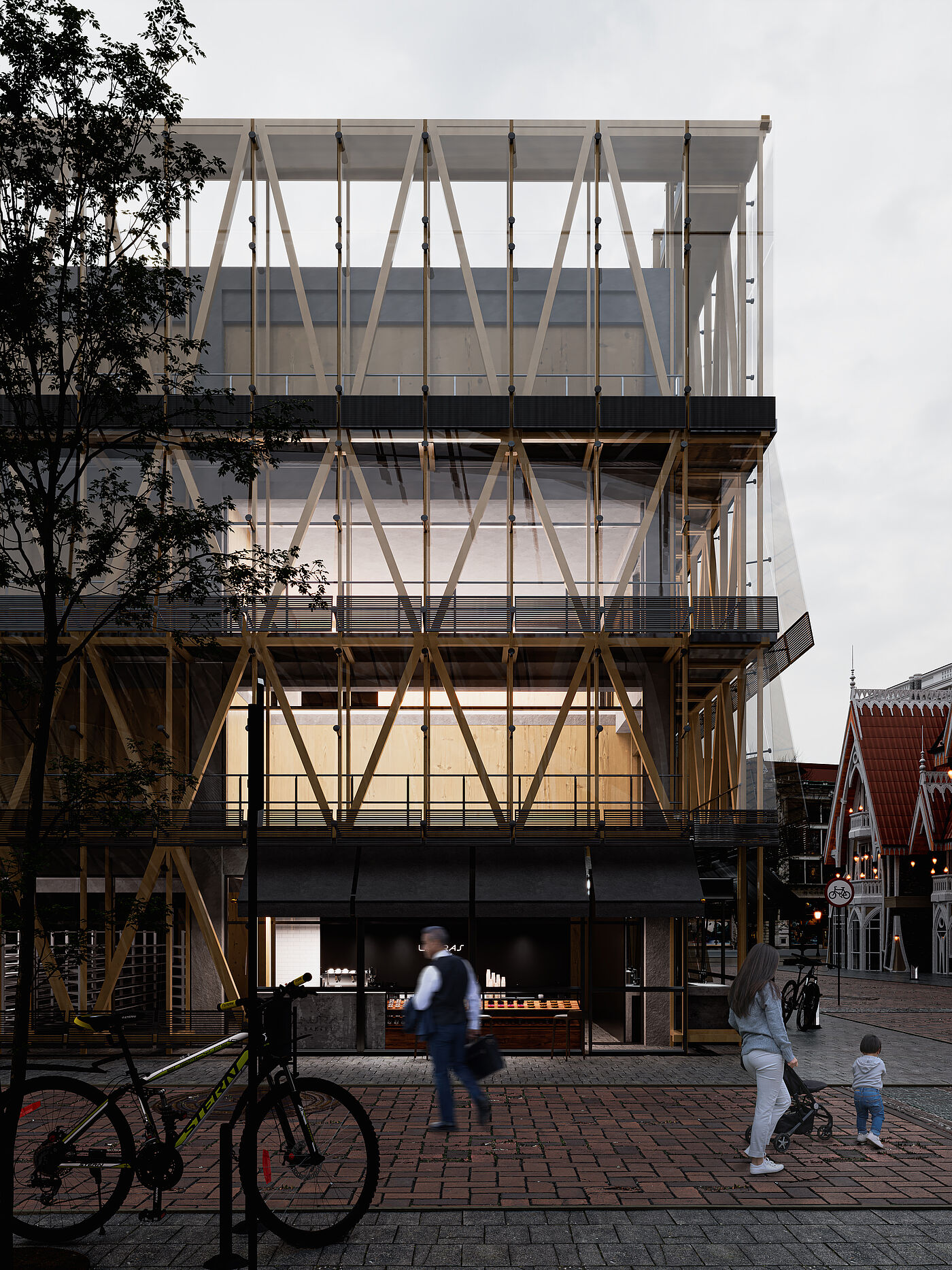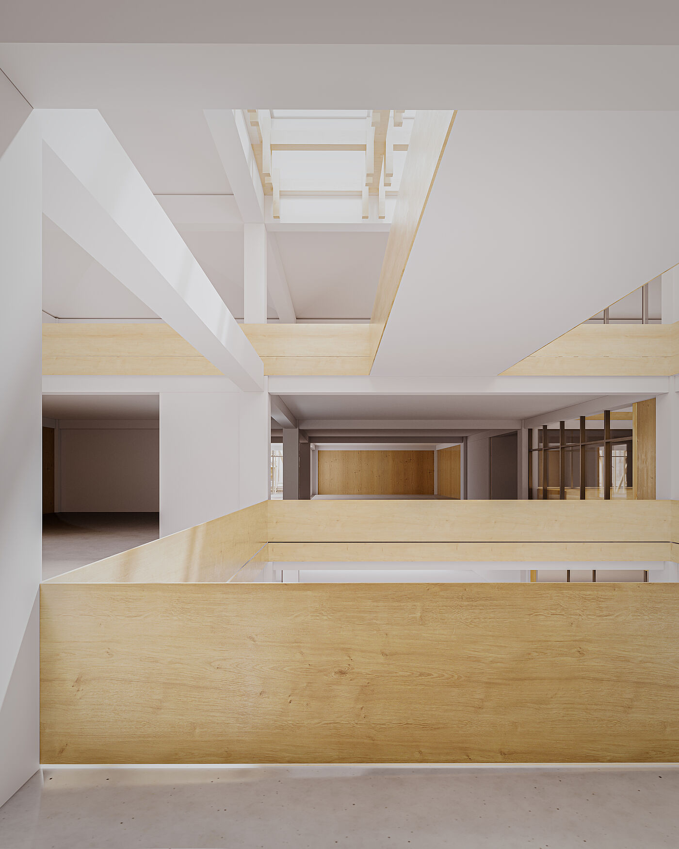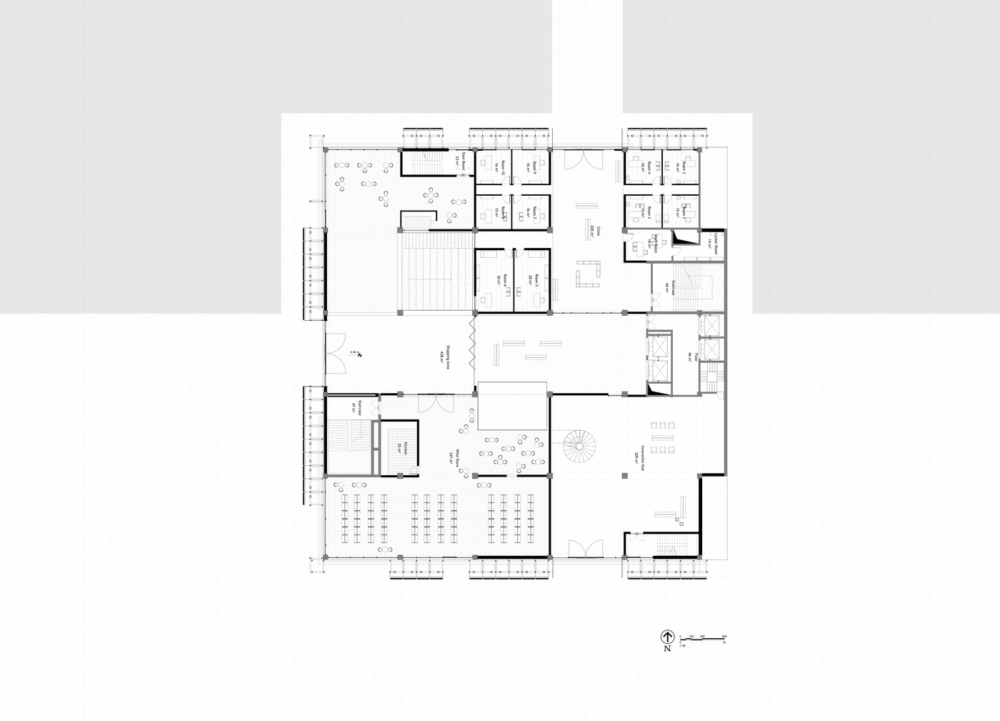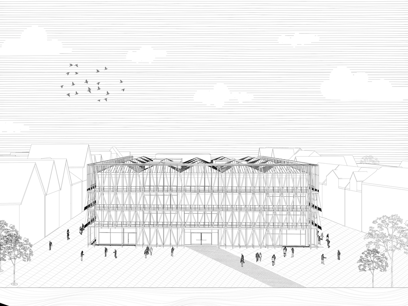 Die Entwurfsstrategie basiert auf Erhaltung und Transformation. Der ursprüngliche Beton-Skelettbau, der vertikale Erschließungskern sowie die offenen Geschossflächen werden erhalten und bewusst inszeniert, um den gebundenen Kohlenstoff zu reduzieren und Bauabfälle zu vermeiden – im Einklang mit den Zielen nachhaltiger Entwicklung. Durch gezielte Eingriffe wie neue vertikale Lufträume, leichte Trennwände und minimale Anpassungen der Deckenstruktur entstehen neue Nutzungen innerhalb des bestehenden Gebäudes Rahmens, ohne dessen Vergangenheit auszulöschen.