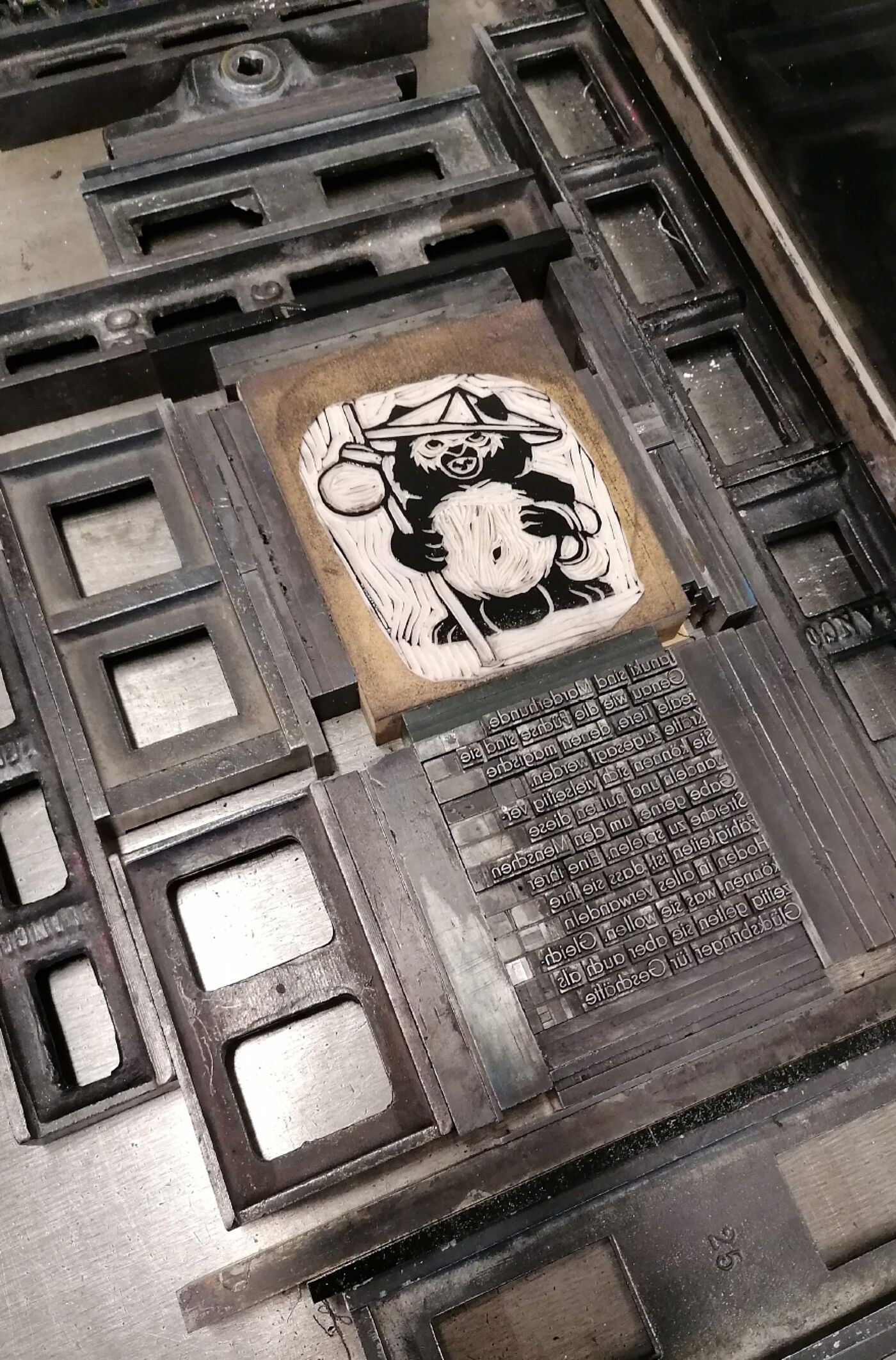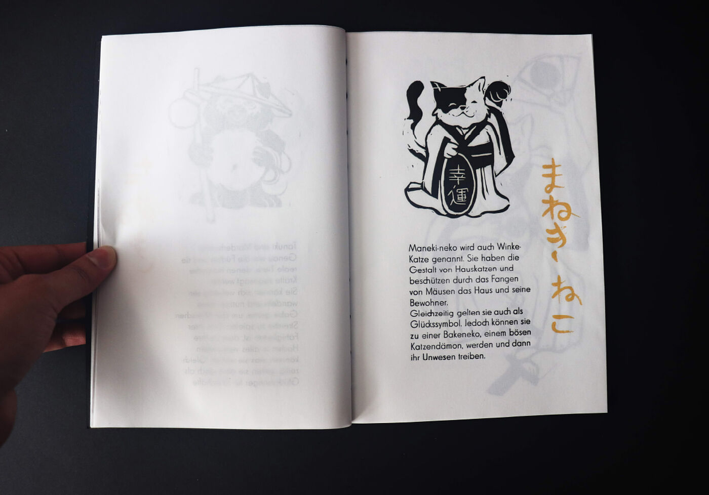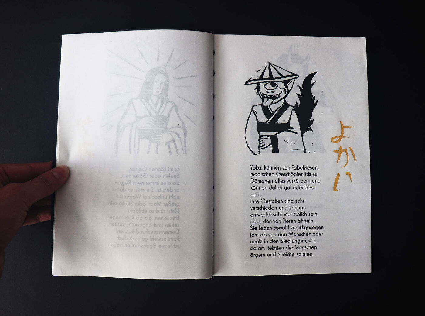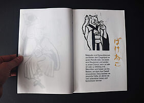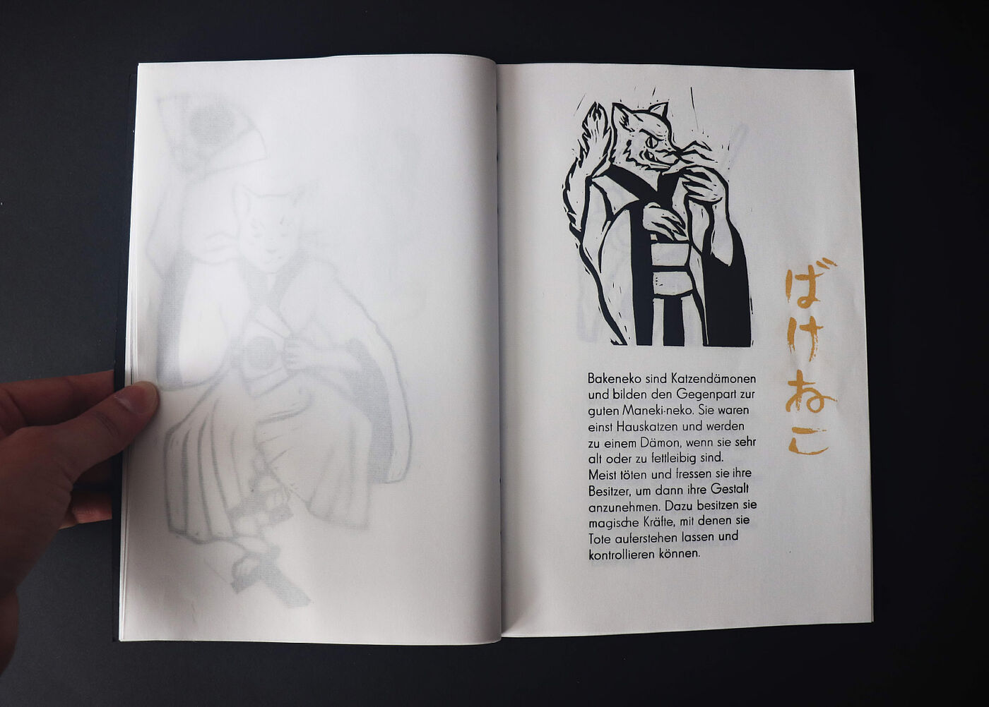 Claire Granereau hat ein Buch daraus gemacht, indem sie erklärt, was es mit den Wesen auf sich hat. Es entstanden Linolschnitte, die zusammen mit dem Bleisatz in einem Druckgang abgezogen wurden. Ergänzend dazu schrieb sie in japanischer Kalligrafie die Namen der Wesen, die dann im Siebdruck als zusätzliches Element und in Gold gedruckt wurde. Die japanische Bindungsart war natürlich auch ein Muss!