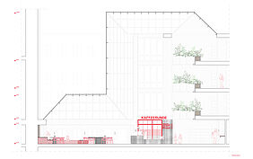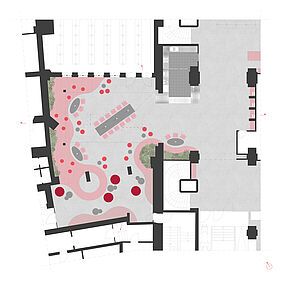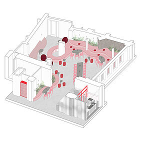 Gestalterisch prägt eine charakteristische Wellenform aus wiederverwendeten Lochblechbögen den Raum, die als Sitzpodest weitergeführt wird und Besucher*innen vom Eingangsbereich bis in die Loungezone leitet. Die Zonierung erfolgt fließend – vom lebendigen Cafébereich mit zentralem Gemeinschaftstisch und Gruppentischen bis hin zum ruhigeren Loungebereich im hinteren Teil. Dort sind der abgesenkte Kinderlesekreis mit integriertem Bücherregal sowie gemütliche Sesselgruppen angesiedelt. Ein Mix aus maßgefertigten und gebrauchten Möbeln schafft ressourcenschonende Aufenthaltsqualität. Die Sitzlandschaften mit verschiedenen Höhen und Möblierungstypen fördern Flexibilität, Austausch und differenzierte Nutzungen – vom Arbeiten bis zum entspannten Verweilen. Farblich und formal unterstützt das Möblierungskonzept die Zonierung, während gezielt platzierte Pflanzkübel das Raumklima verbessern und eine Verbindung zum angrenzenden Atrium schaffen. Der seitlich positionierte Cafétresen bildet das visuelle Zentrum des Eingangsbereichs und vereint Funktionalität mit gestalterischer Präsenz. Als autarke Einheit konzipiert, wird er durch einen abgetrennten Küchenbereich ergänzt, der mit hellen Fliesen einen modernen Kontrast zur bestehenden Backsteinstruktur bildet. Insgesamt entsteht ein Raum, der durch präzise Gestaltung und soziale Offenheit überzeugt – und die Bibliothek zu einem Ort der Gemeinschaft weiterdenkt.