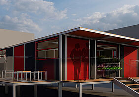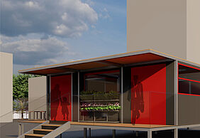 Darüber hinaus bietet die KINETIC KITCHEN an jedem Ort Aufenthaltsqualitäten. So können Marktplätze und Campus kurzfristig mit einer temporären Architektur umgestaltet und ergänzt werden. Die Terrasse der KINETIC KITCHEN bietet einen Ort mit besonderer Aufenthaltsqualität. Hier können z. B. die zubereiteten Speisen genossen werden. Vorstellbar ist auch, die Architektur für Firmenevents, Veranstaltungen o.ä. zu vermieten. Durch das Gestaltungskonzept ist die KINETIC KITCHEN überall ein edler Hingucker, der nicht zu übersehen ist und zugleich neugierig macht. Insbesondere auch durch die kinetische Architektur, die als Referenz an die Form des Marktstandes erinnert, sowie ihren Eisenbahnanhänger ähnlichen Charakter, weckt sie großes Interesse.