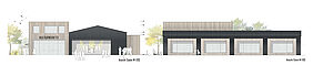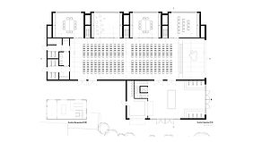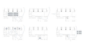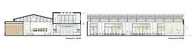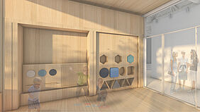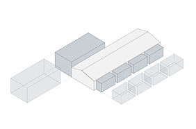 Das Innere gliedert sich in einen Eingangsbereich mit Bar, eine Haupthalle und kleinere Räume in den Kuben. Ein neu gestalteter Außenbereich bietet bei warmem Wetter Aufenthaltsmöglichkeiten im Freien. Der riegelförmige Anbau mit über sieben Metern Höhe ermöglicht zwei Geschosse, in denen ein Sportraum und ein Sitzungssaal mit Ostseeblick untergebracht sind. Das Obergeschoss dient zudem als dauerhafte Ausstellungsfläche für Fotografien. Ein besonderes Highlight ist eine wellenförmige Skulptur aus Formvlies im Luftraum des Anbaus. Die Bar kann sowohl innen als auch außen betrieben und bei Nichtgebrauch durch ein Faltladensystem verschlossen werden. Die multifunktionale Haupthalle verfügt über vollautomatische Schiebewände, die aus den Zwischenräumen der Kuben herausgefahren werden können, um den Raum flexibel zu unterteilen. Die Bühne ist so konzipiert, dass sie sowohl nach innen als auch nach außen bespielt werden kann, ermöglicht durch ein Hebefalttor. Die Kuben bieten kleinere Räume für Fotografie-Workshops, Schulungen oder Kinderaktivitäten.