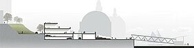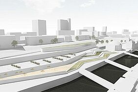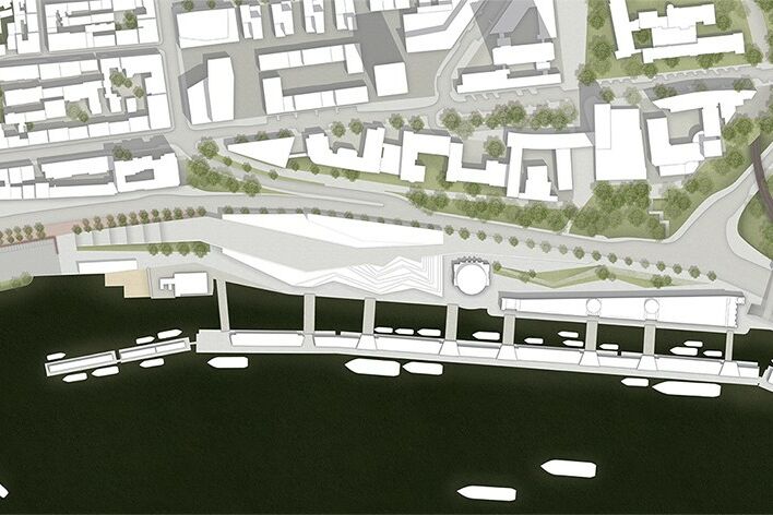 Für die Neugestaltung des Umfeldes des Alten Elbtunnels in Hamburg greift dieser Entwurf die bestehenden Raumkanten auf und überträgt diese in ein neues Raumgefüge, das verschiedene Geschäfte, Cafes und Restaurants aufnimmt. Gleichzeitig wird das Plangebiet zoniert in einen Verkehrsbereich und in einen attraktiv gestalteten, verkehrsberuhigten Freiraum am Wasser. Die Erschließung des Gebäudes erfolgt über eine Promenade, unter der Stellplätze für Autos und Busse vorgesehen sind.