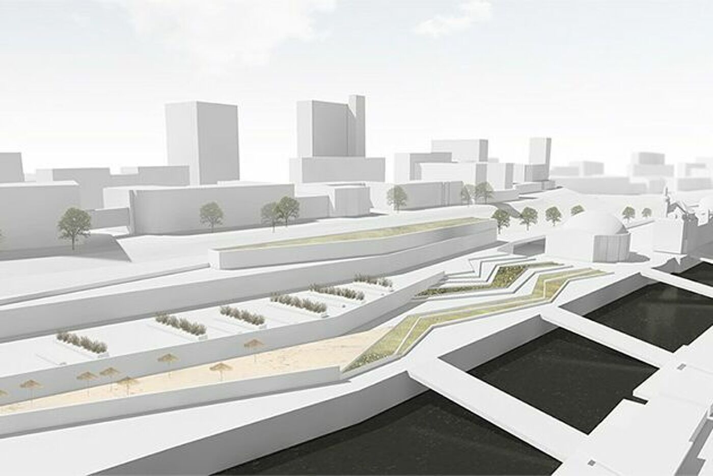 Ein weiteres Charakteristikum des Entwurfes ist die Treppenanlage, die durch ihre Form und Größe weithin sichtbar ist. Sie ist westlich des Alten Elbtunnels als funktionaler Treppenaufgang konzipiert, um dort eine Platzsituation zu schaffen. In Richtung südlicher Waterfront ist sie deutlich großzügiger gestaltet und lädt zum Verweilen und Entspannen ein. Durch die Integration eines Beachclubs in den Entwurf wird zusätzliche Strandatmosphäre im urbanen Raum geschaffen. Der Entwurf bezieht sich nicht nur auf eine Zielgruppe, sondern vereint verschiedene Nutzergruppen und Angebote, sodass eine attraktive Nutzungsmischung bei hoher Aufenthaltsqualität gewährleistet wird.