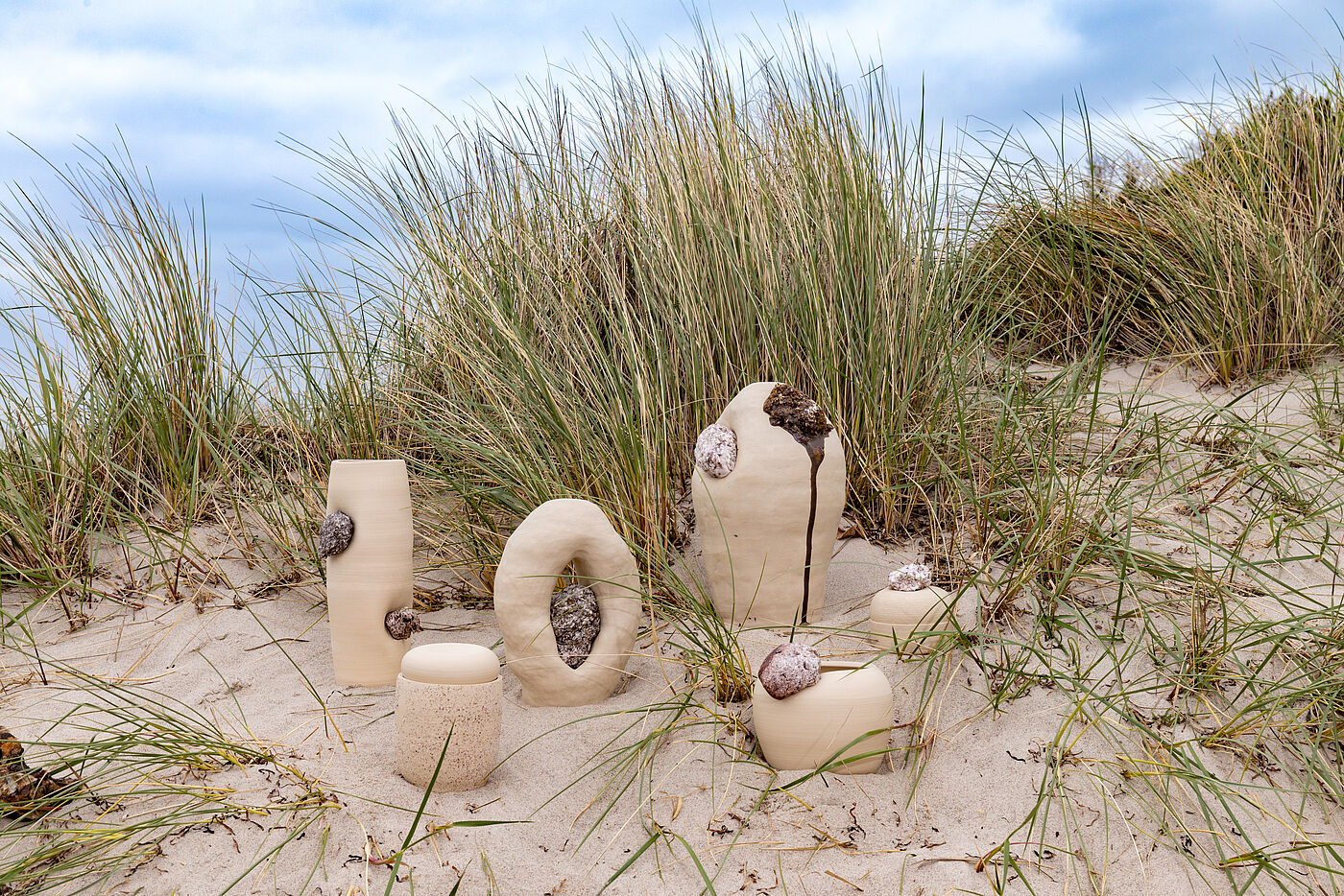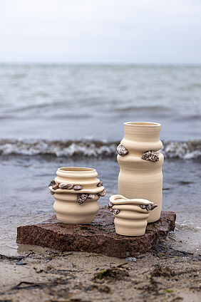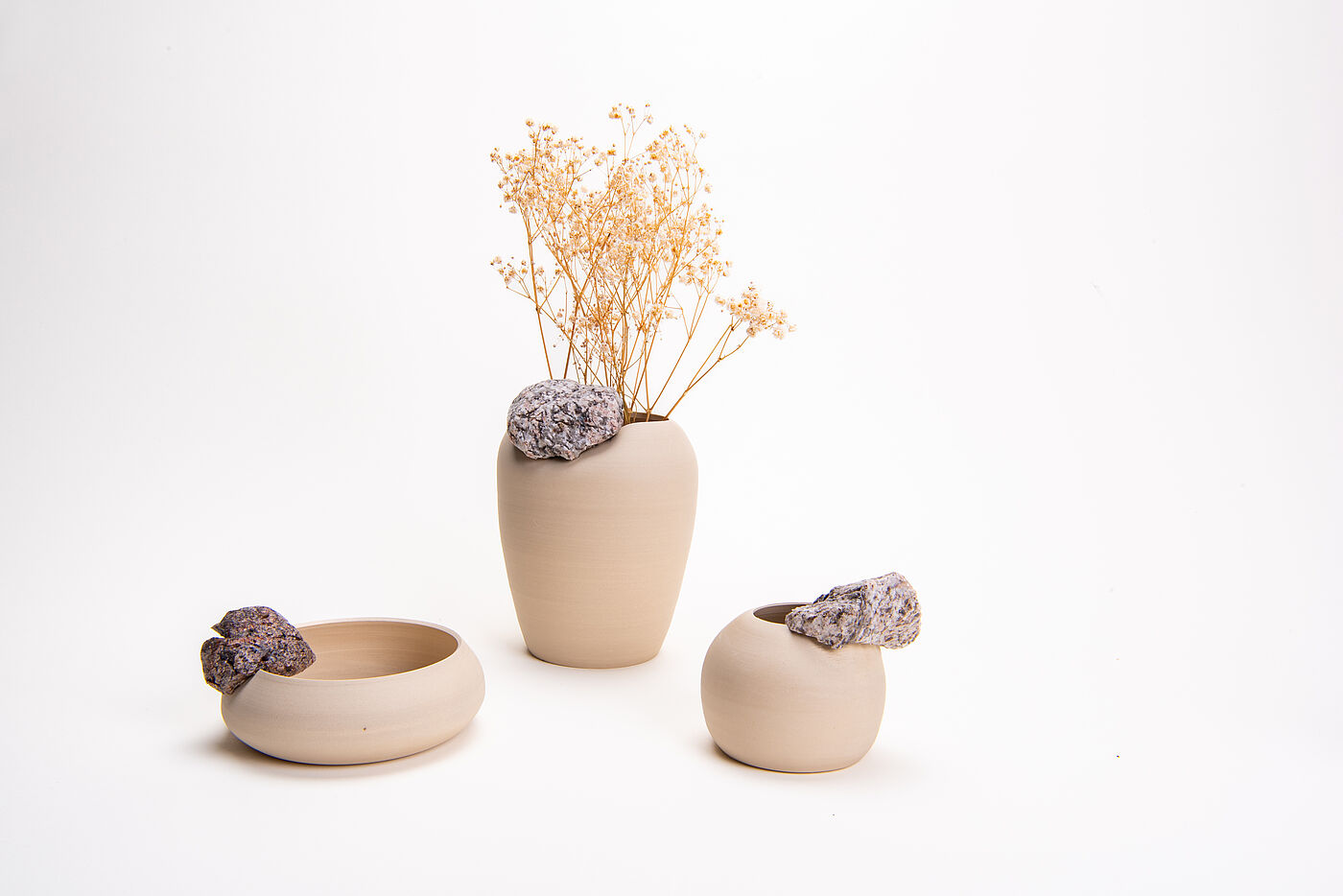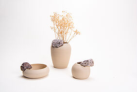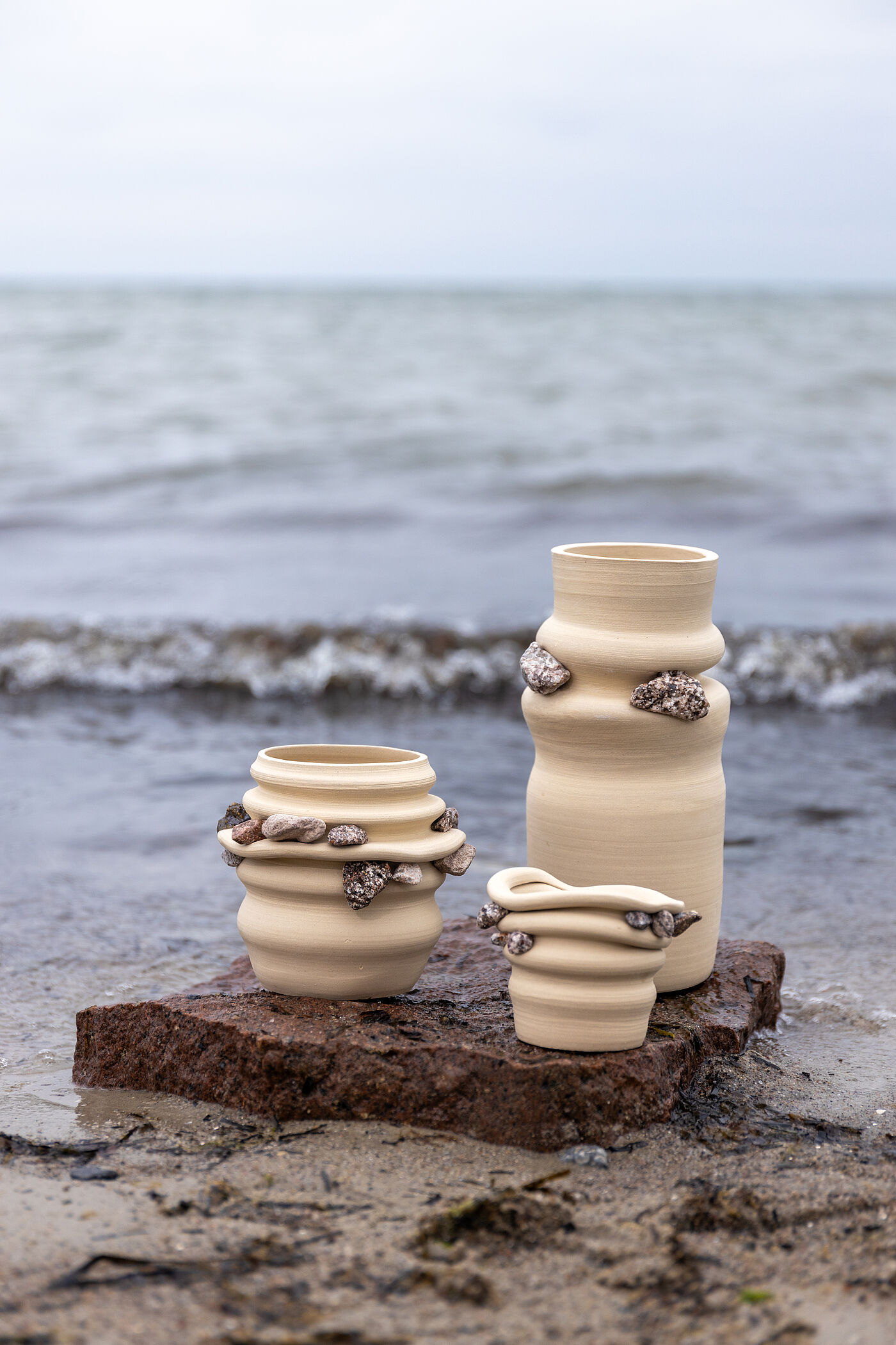 Die Abschlussarbeit „Melting Features“ widmet sich der Erforschung experimentellen Handwerks am Beispiel der besonderen Verbindung von Keramik und Ostseesteinen. Durch eine Vielzahl an Versuchsreihen entstand eine Serie von Objekten wie Dosen, Vasen und Schalen, die das ästhetische Potenzial und die Vielseitigkeit dieser ungewöhnlichen Materialkombination herausstellen.