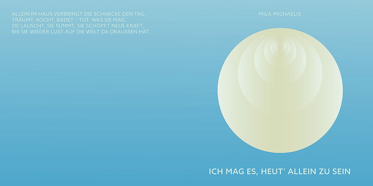 In dem Bilderbuch „Ich mag es, heut‘ allein zu sein“ wählt Mila Michaelis (KuM) die Schnecke als Metapher, um den Prozess einer kontemplativen Ruhe- bzw. Rückzugsphase in ruhigen, farblich sehr zurückhaltenden, abstrakten und dennoch sehr poetischen Bildern und Reimen zu beschreiben.
