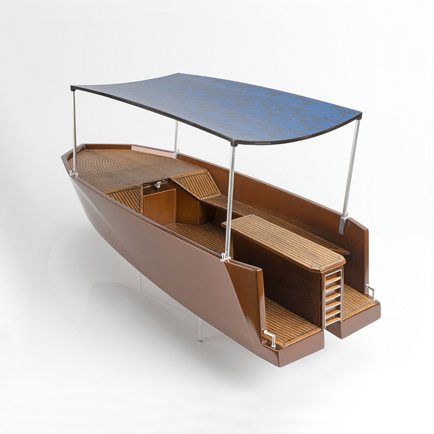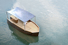 So gestaltet sich das Bootsdeck zu einem übersichtlichen Bereich, der die Möglichkeit zu liegen, zu sitzen oder zu stehen unspezifisch und nur über drei Höhenniveaus gegliedert, anbietet. Alle horizontalen und als Verstauraum angelegten Flächen sind durchgehend mit Holz verkleidet und unterstützen mit dem als Photovoltaiksystem ausgeführten, leicht geschwungenen Sonnenschutz ein minimalistisches und elegantes Bild.