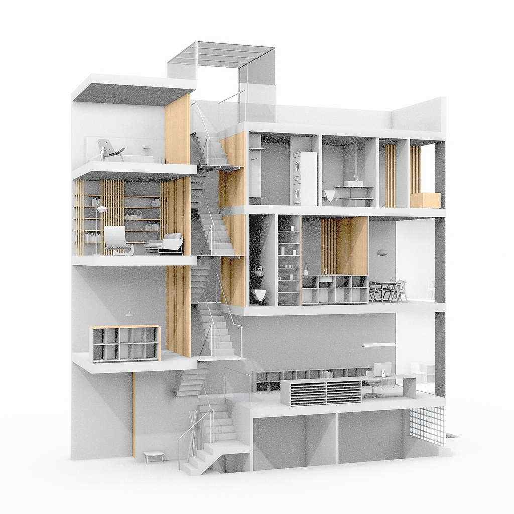 Die Raumanordnung richtet sich nach der Himmelsrichtung und dem daraus ergebenden Lichteinfall. Vom Eingang im Erdgeschoss aus werden die Räume nach oben hin immer privater. Große hohe Räume werden für Empfang und als Atelier genutzt, kleine tiefe Räume zum Entspannen und Schlafen. Neben festverbauten Schränken und Regalen wird das Interieur ergänzt durch Möbel der klassischen Moderne.