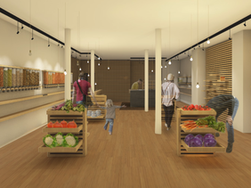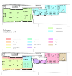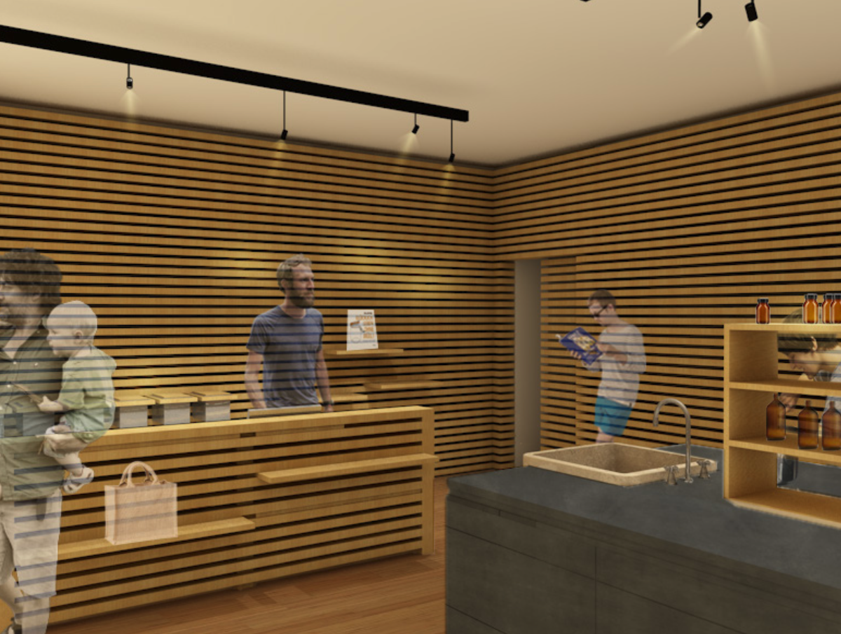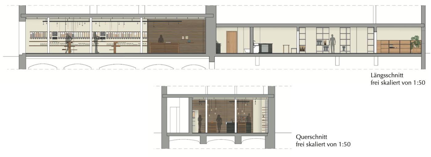 Übersichtlichkeit ist einer der Hauptpunkte des Konzeptes. Ein schnelles Zurechtfinden erhöht das Wohlbefinden der Kunden und lässt sie offen dem Neuen gegenüber. Nachhaltige Materialien, wie Bambus, Lehmputz und Keramik schaffen eine angenehme Atmosphäre.