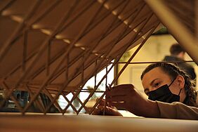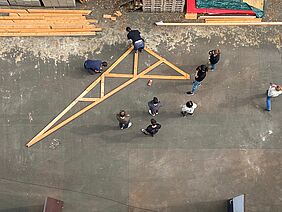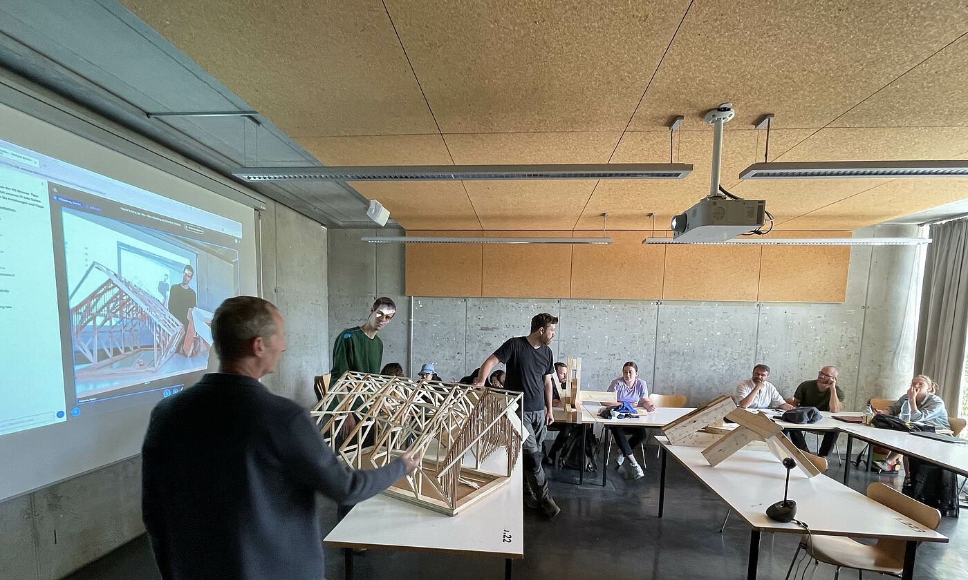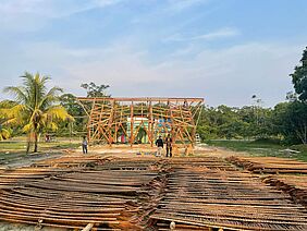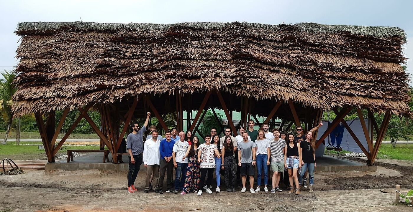 Das Seminar zum Bauprojekt in Iquitos war in drei Blöcke unterteilt und startete im Wintersemester 2021/ 22. Basierend auf einer Einführung in traditionelle, lokale Bautechniken sowie der Auseinandersetzung mit den programmatischen Bedarfen der Nutzer wurde im ersten Block ein Entwurf für das Laborensemble und seine Konstruktionsweise im Maßstab 1:50 ausgearbeitet. Im zweiten Schritt wurden die Ergebnisse in gemeinsamen wöchentlichen, digitalen Arbeitsgruppen mit den Studierenden der Tragwerksplanung der UTE (Universidad Tecnológica Equinoccial, Ecuador) bis zur Ausführungsreife weiterentwickelt. Der dritte Block war der finalen Ausformulierung der Detailplanung in 1:5, der Bauablaufplanung sowie der Vorbereitung der Reise und des Bauworkshops in Iquitos im August 2022 gewidmet. Das Projekt wurde unter Leitung von Proessorin Britta Wauer durch Studierende des Studiengangs Kommunikationsdesign und Medien dokumentarisch begleitet.