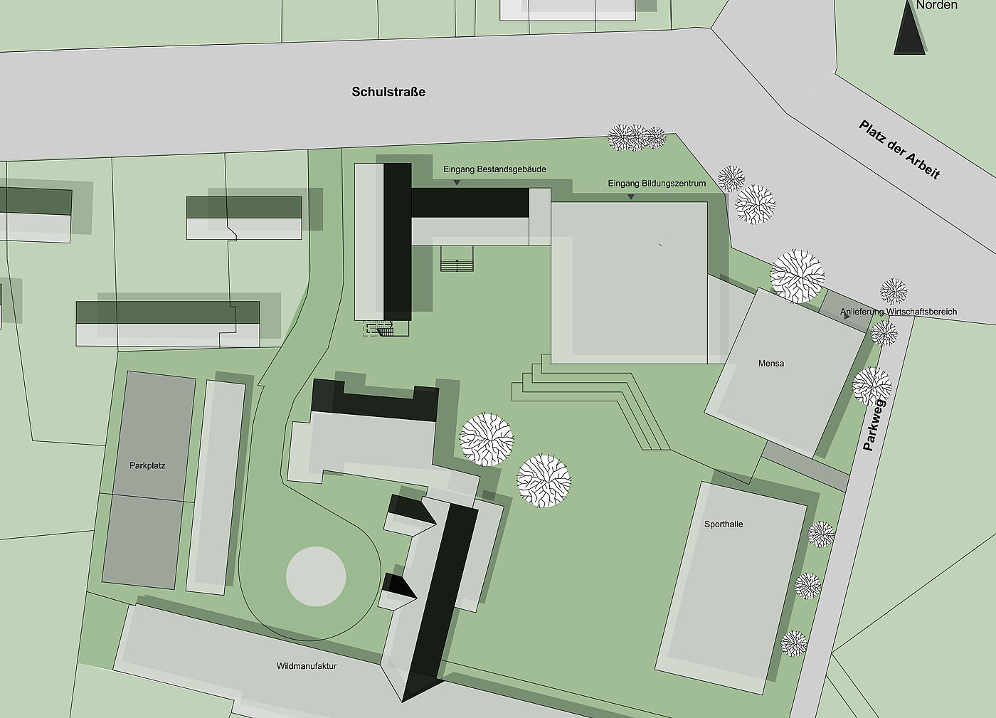 Planungsanlass sind leerstehende Gebäudeteile der ehemaligen Polytechnischen Oberschule, die 2006 geschlossen wurde. Auf dem Gelände hat sich in Nebengebäuden eine Wildmanufaktur angesiedelt. Die angrenzende Sporthalle ist im Eigentum der Gemeinde und wird für verschiedenste Veranstaltungen und Aktivitäten durch die Bewohner*innen genutzt. In direkter Nachbarschaft befinden sich Wohngebäude.