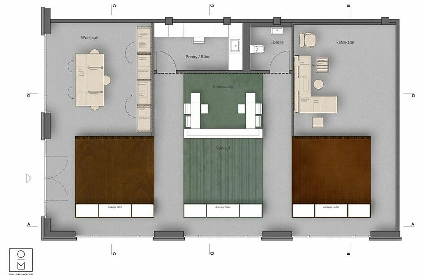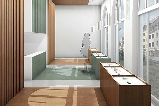 Dieser Optiker stellt handwerklich maßgeschneiderte Brillengestelle aus Holz, Stein und Leder her. Der Kerngedanke der Reduktion auf die drei Naturmaterialien spiegelt sich in der Gestaltung wieder. Dafür werden diese drei Materialien als raumbildende Elemente eingesetzt und teilen die Fläche in einzelne Bereiche.