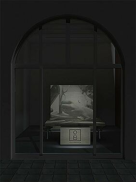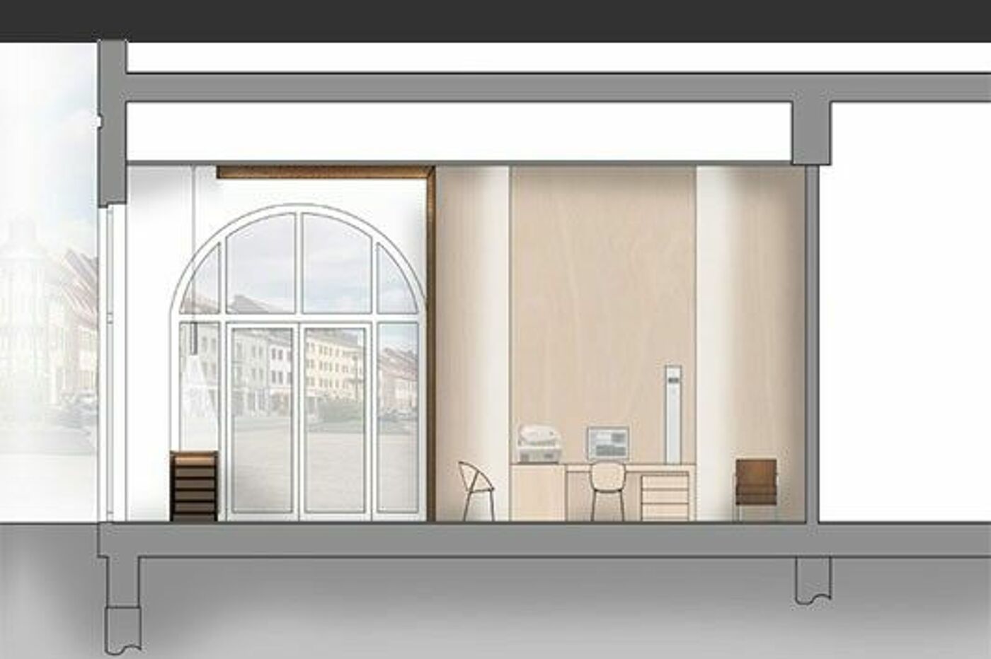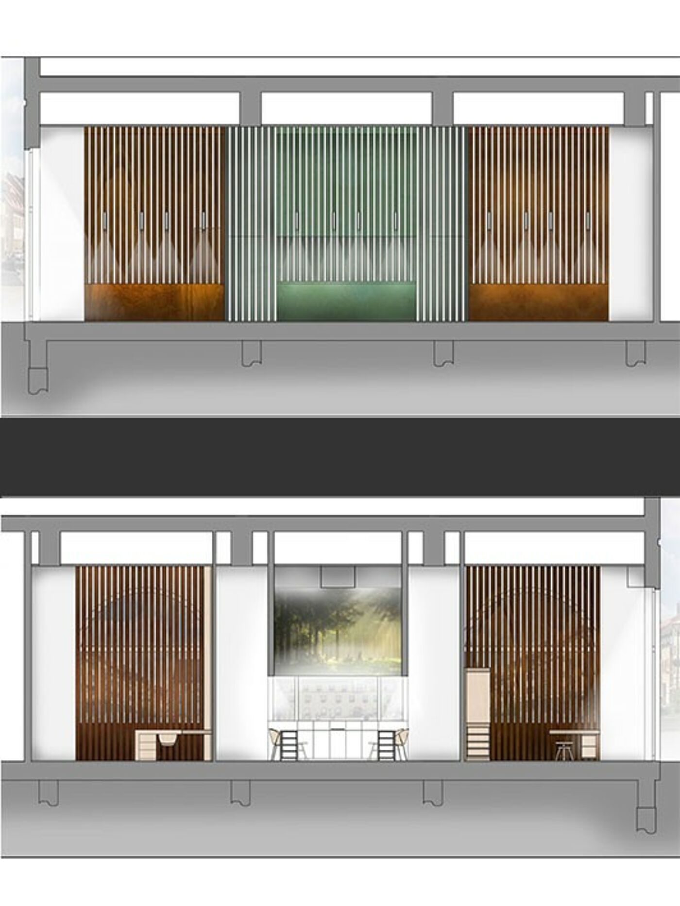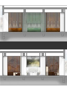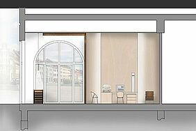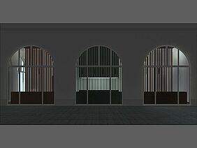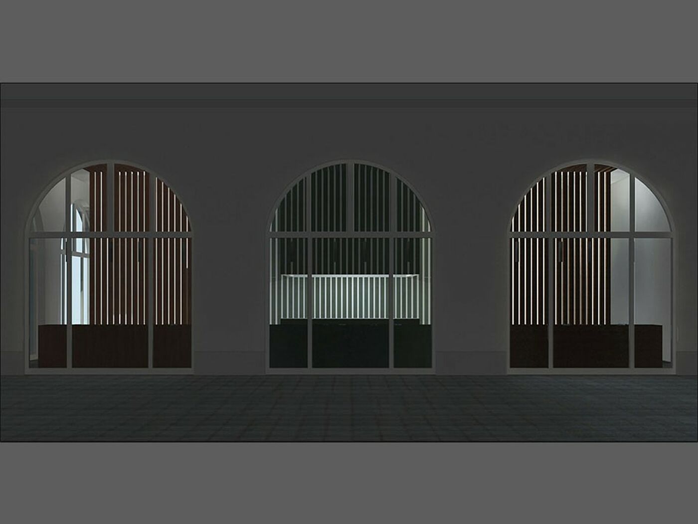 Die vertikalen Lamellen ermöglichen einen transparenten, homogenen Eindruck, unterstützen richtungsweisend die enorme Raumhöhe und betonen darüber hinaus die großen Bogenfenster. In die drei Bereiche integriert sind Auslagen, in denen die entsprechenden Beispielgestelle präsentiert werden. Die Werkstatt ist durch das große Fenster von außen einsehbar und tagsüber als Manufaktur erlebbar. Nachts wird der Werkstattschrank geschlossen und dient als Projektionsfläche für unterschiedliche Darbietungen.