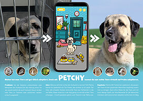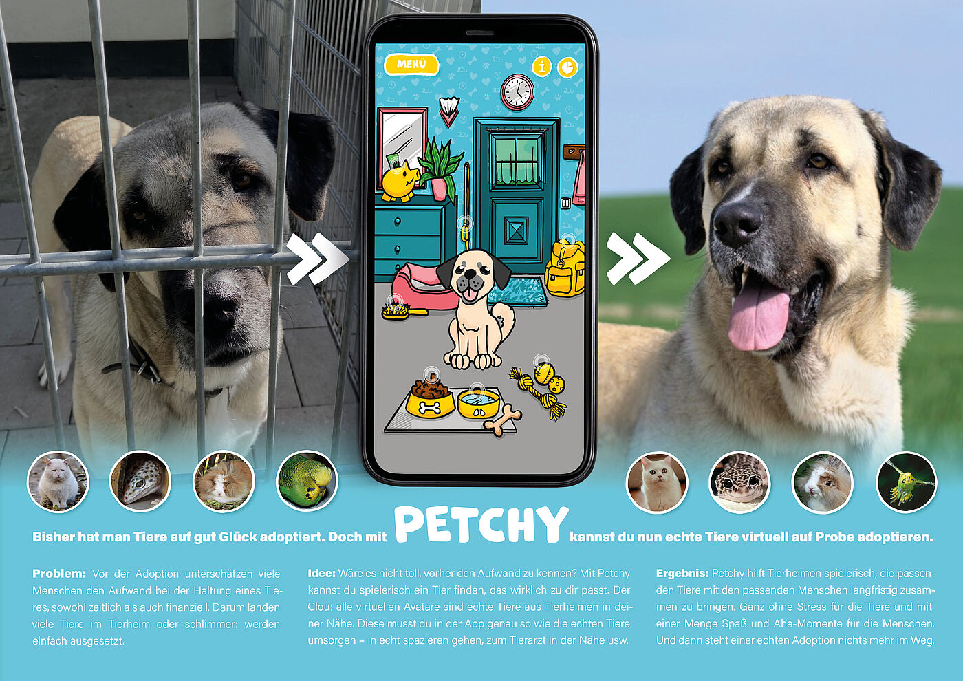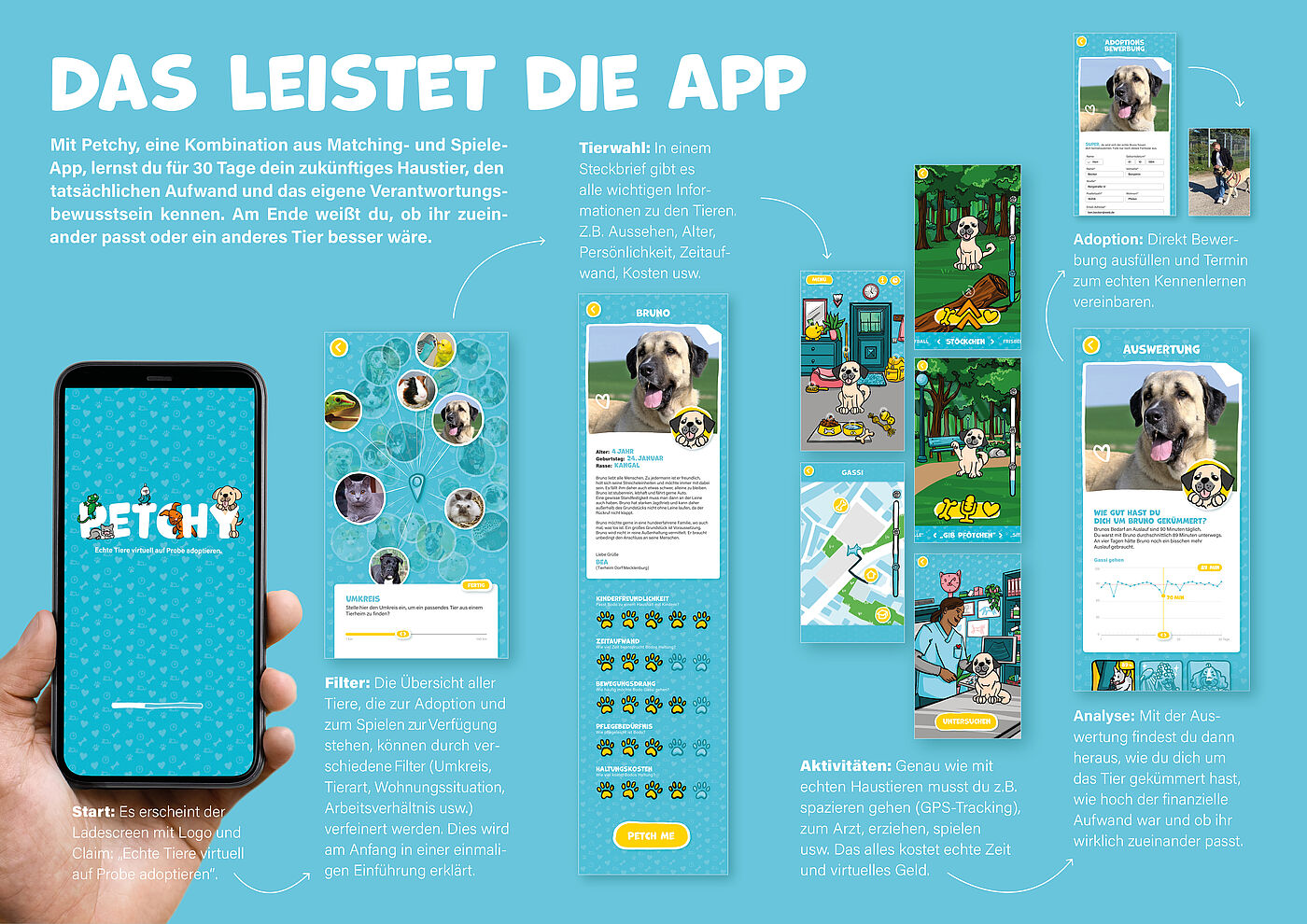‚Petchy‘ ist eine App, die beim kompletten Prozess auf der Suche nach einem neuen Haustier unterhaltsam unterstützt. Anhand von Parametern zur eigenen Lebenssituation werden Tiere aus Tierheimen im näheren Umfeld vermittelt. Man kann sich die Steckbriefe anzeigen lassen und sobald man ein gutes Gefühl hat, ist die virtuelle Adoption innerhalb von Sekunden erledigt. Schon ist das Haustier „eingezogen“ und man kann sich sofort darum kümmern. Dabei verhält sich das virtuelle Haustier genau wie das echte, denn dessen Eigenschaften wurden vorher von Tierheimmitarbeiter:innen in die App eingepflegt. D.h. der virtuelle Avatar, den theoretisch hunderte Menschen gleichzeitig adoptieren können, hat die gleichen Eigenschaften und Bedürfnisse wie das echte Tier. So muss man mit einem Hund nicht nur wirklich mehrmals täglich Gassi gehen (GPS-Tracking), sondern bei Vorerkrankungen auch wirklich zum nächsten Tierarzt (Google Maps) und dann virtuell Medikamente, Tierfutter usw. kaufen. Dadurch lernt man nicht nur Aufwände, Tierpflege, Kosten usw. kennen, sondern auch gleich alle wichtigen Orte in der eigenen Umgebung. Am Ende gibt’s eine Auswertung und wenn man selbst zum Tier und das Tier zu einem passt, wird man auch noch bei der echten Adoption unterstützt.