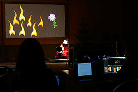 Mit einem analog produzierten Schattenspiel inszenierte die Gruppe „Peter und der Wolf“ – anders der Stil der Animationen für „Schneewittchen“: Figuren und wichtige Sujets wurden abstrakt dargestellt und digital entworfen. Die Aufführung wurde mit einer Video-Software projeziert die es unter anderem erlaubt, Animationen live und punktgenau mit der musikalischen Aufführung synchron darzubieten.