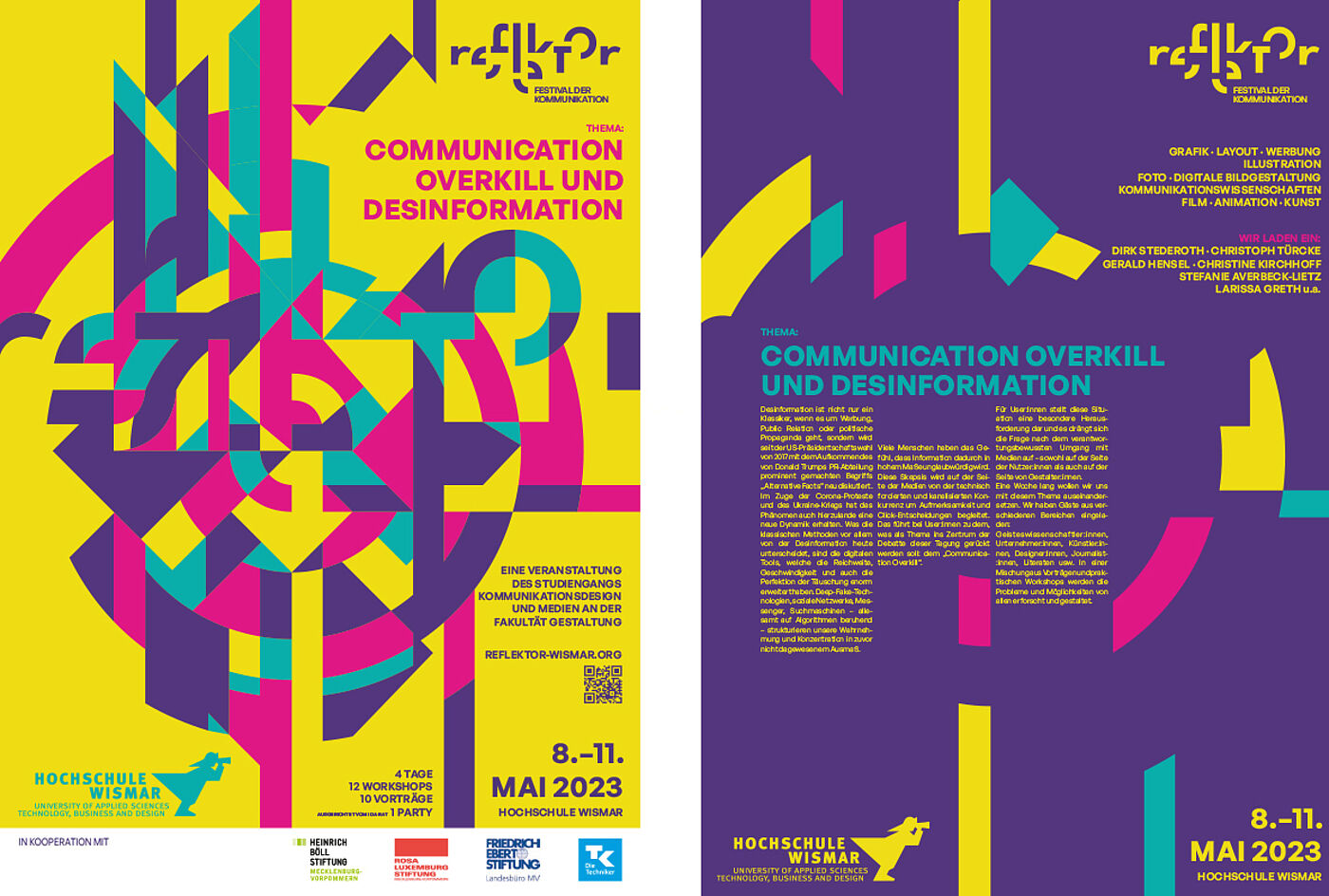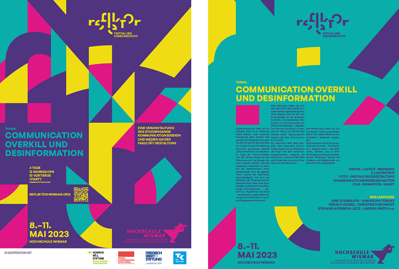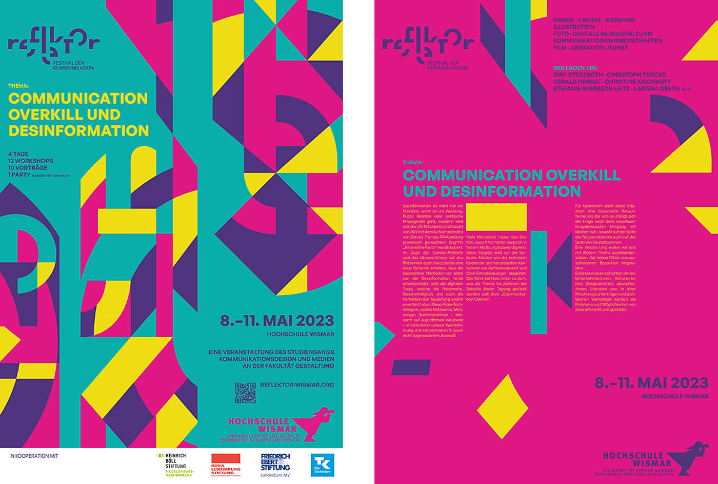 Dafür entwickelte die Projektgruppe das Corporate Design, dessen Herzstück das Logo ist. Drei unterschiedliche Plakatmotive werben für die Veranstaltung. Das Programm findet sich jeweils auf der Rückseite. Zum Corporate gehören weiterhin Postkarten, der Internetauftritt und die Gestaltung des Festivals. Es wird die Veranstaltungen der nächsten Jahre begleiten.