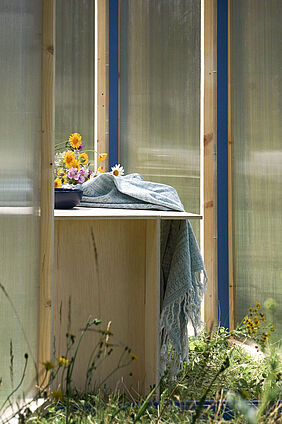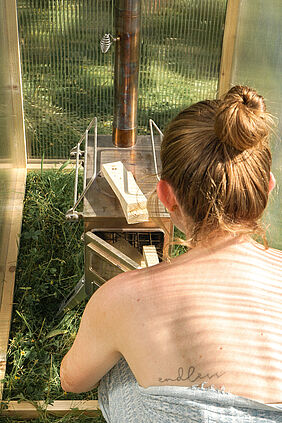 Ein leichter Zeltofen sorgt für angenehme Wärme, steckbare Bänke ermöglichen komfortables Sitzen. Die Konstruktion verzichtet bewusst auf überflüssige Komplexität – im Fokus stehen intuitive Montage, minimale Bauteileanzahl sowie robuste, leichte und wiederverwendbare Materialien. Jedes Element wurde hinsichtlich Transport, Gewicht und thermischer Effizienz durchdacht und optimiert.