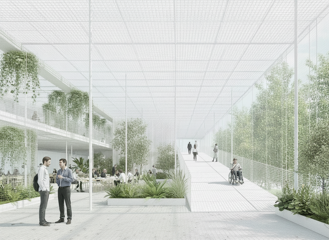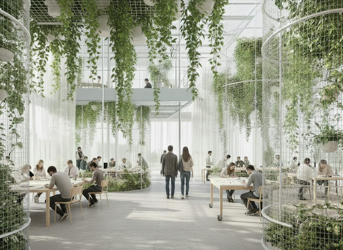 The architecture is based on a steel structure with mesh-panel elements, creating the potential for an indoor biotope. The interior dissolves into a self-sustaining organism: self-growing mycelium panels and algae panels regulate the climate, while filtering air and water to maintain a healthy indoor environment. These panels contribute to the biological material cycle, produce oxygen, and absorb CO₂. The façade design thus supports a comfortable and productive interior climate without relying on fossil resources. The building functions as a self-sustaining body, requiring no external inputs and becoming a source of energy and life.
