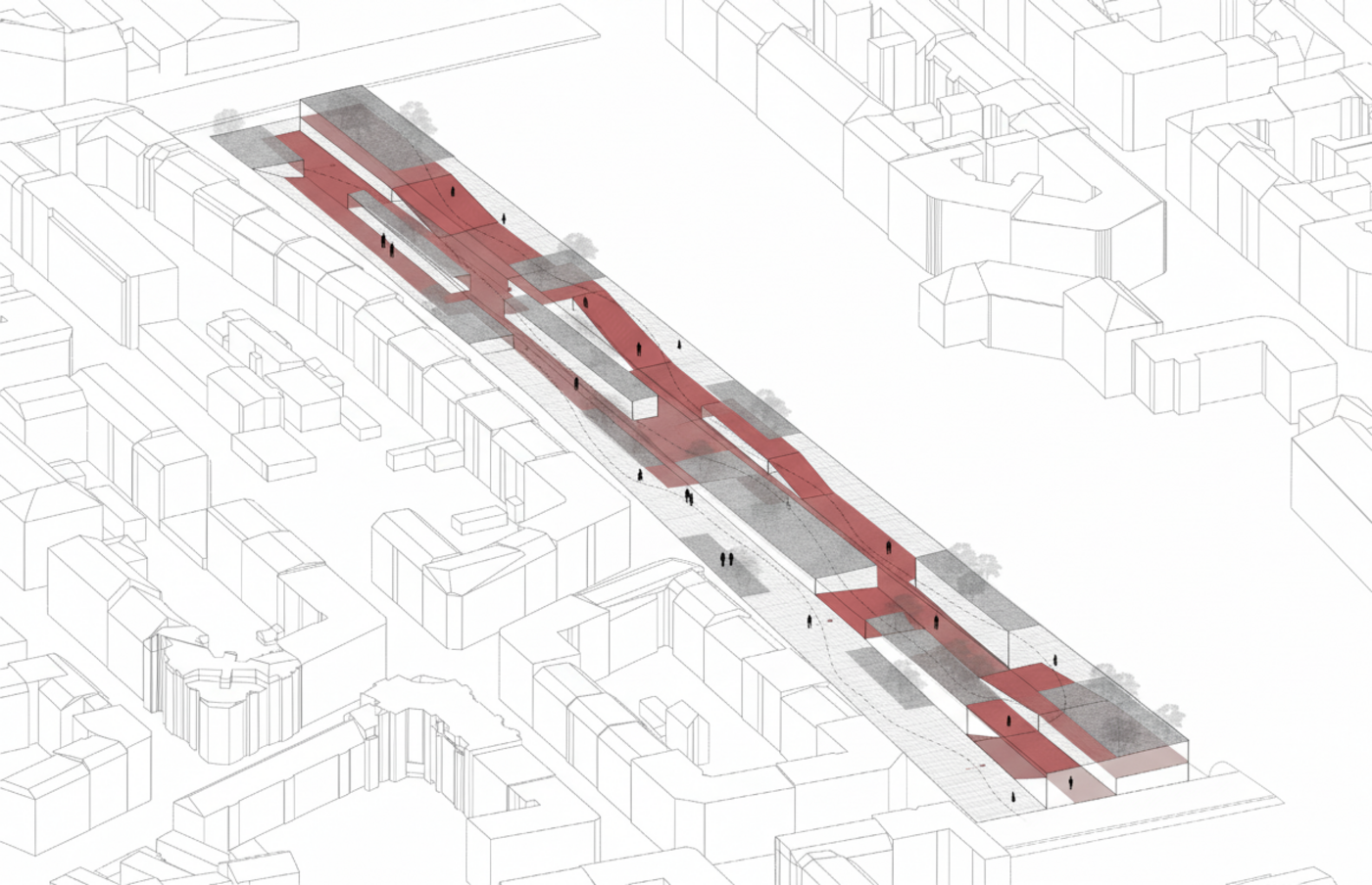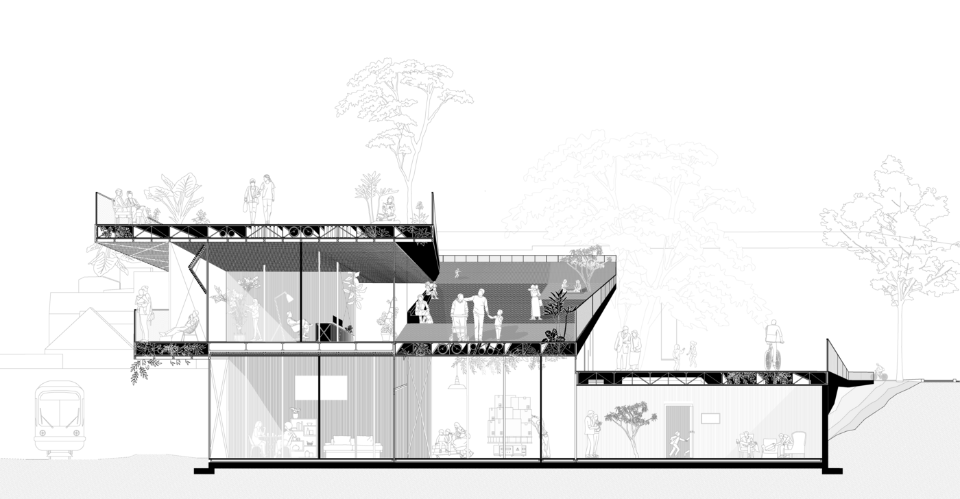 The ramp functions as both circulation and space of inhabitation, hosting temporary use. It becomes an open platform where different generations and diverse groups meet, interact, and share space. Nature intertwines with infrastructure. Levels dissolve, creating a space of plants and living systems. The infrastructure transforms into a living organism. The structure merges with nature, becoming part of the landscape, harmoniously integrating while filling gaps in the topography.