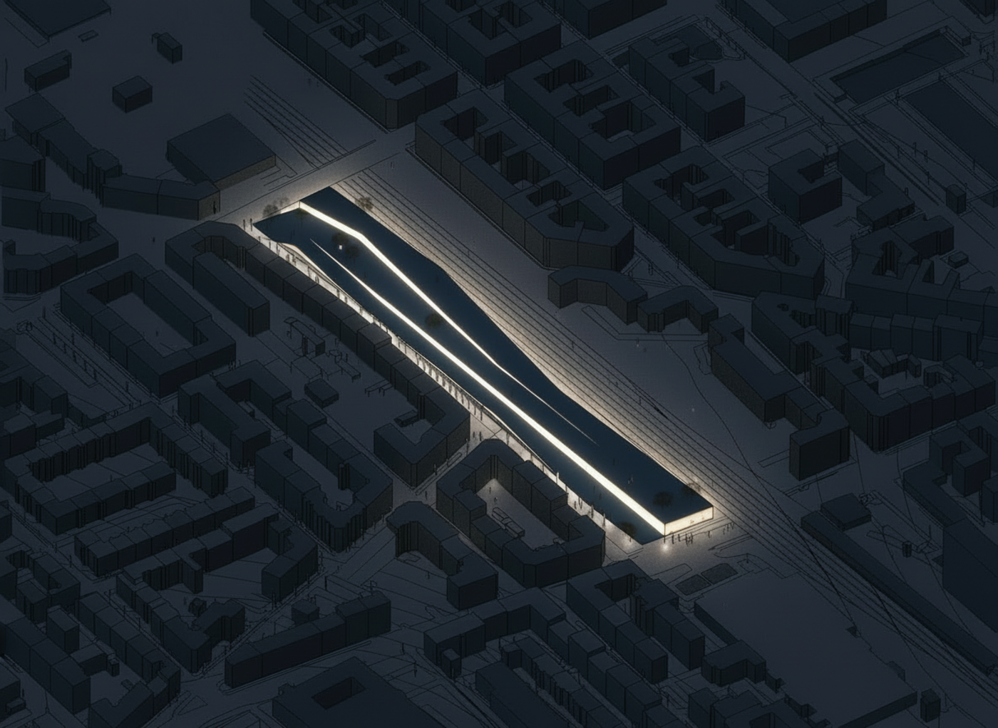 The increasing height creates a clear separation from the railway tracks, while framed views establish visual connections between visitors and the tracks in both the interior and exterior spaces, turning the infrastructure into an active part of the spatial experience.