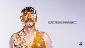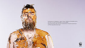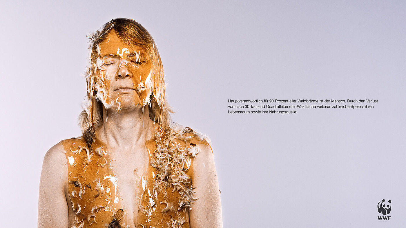 Der Akt des Teerens und Federn wurde durch das Übergießen mit Honig nachempfunden. Natürlich kein echter Honig, sondern mit einer honigähnlichen Masse bestehend aus Zucker, Wasser und Lebensmittelfarbe. Außerdem wurden unterschiedliche Federarten verwendet, um die Bandbreite der negativen Auswirkungen unseres Handelns zu verdeutlichen. Das Ergebnis nach unzähligen klebrigen Versuchen im Fotostudio: starke und beschämende Bilder der Schuld, ergänzt um kurze faktische Texte.