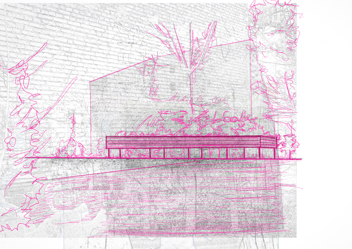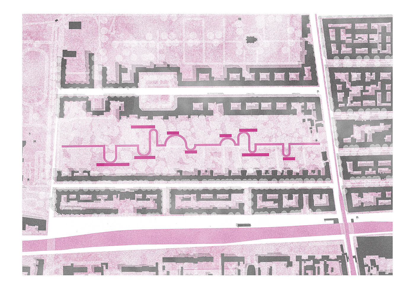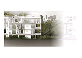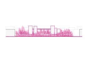 Der Entwurf CrownTown entwickelt sich wie ein Palimpsest, das Altes bewahrt und Neues integriert. Die Riegel, auf Stützen gelagert, minimieren die Bebauung des Friedhofs und respektieren so den Ort. Ihre Positionierung und Dimensionierung orientieren sich am vorhandenen Baumbestand.