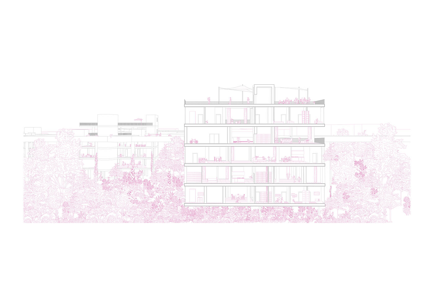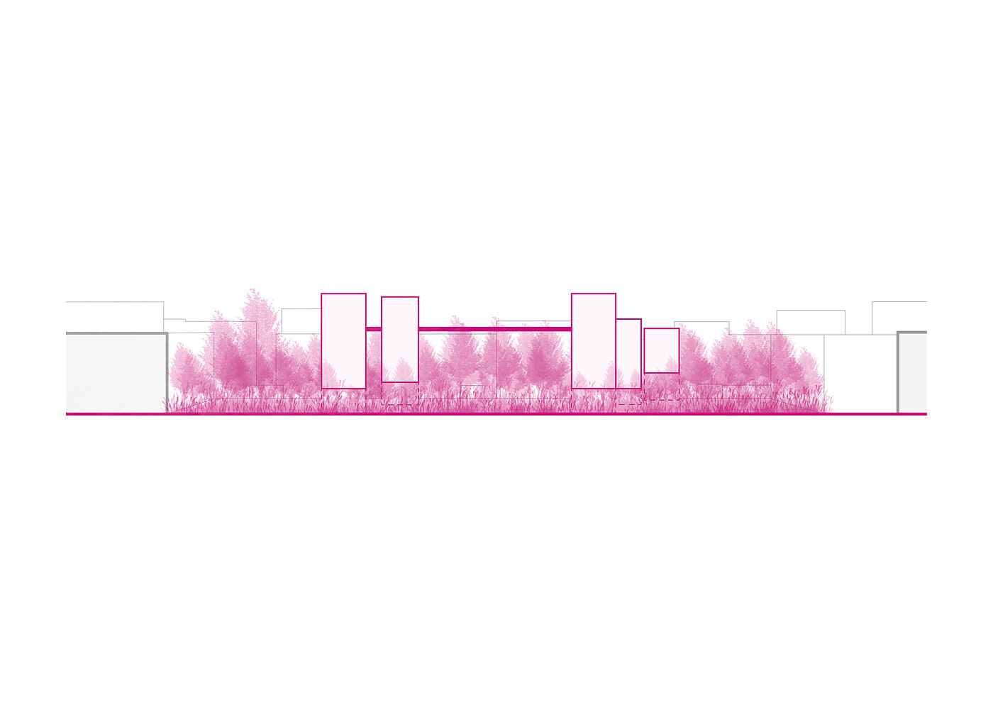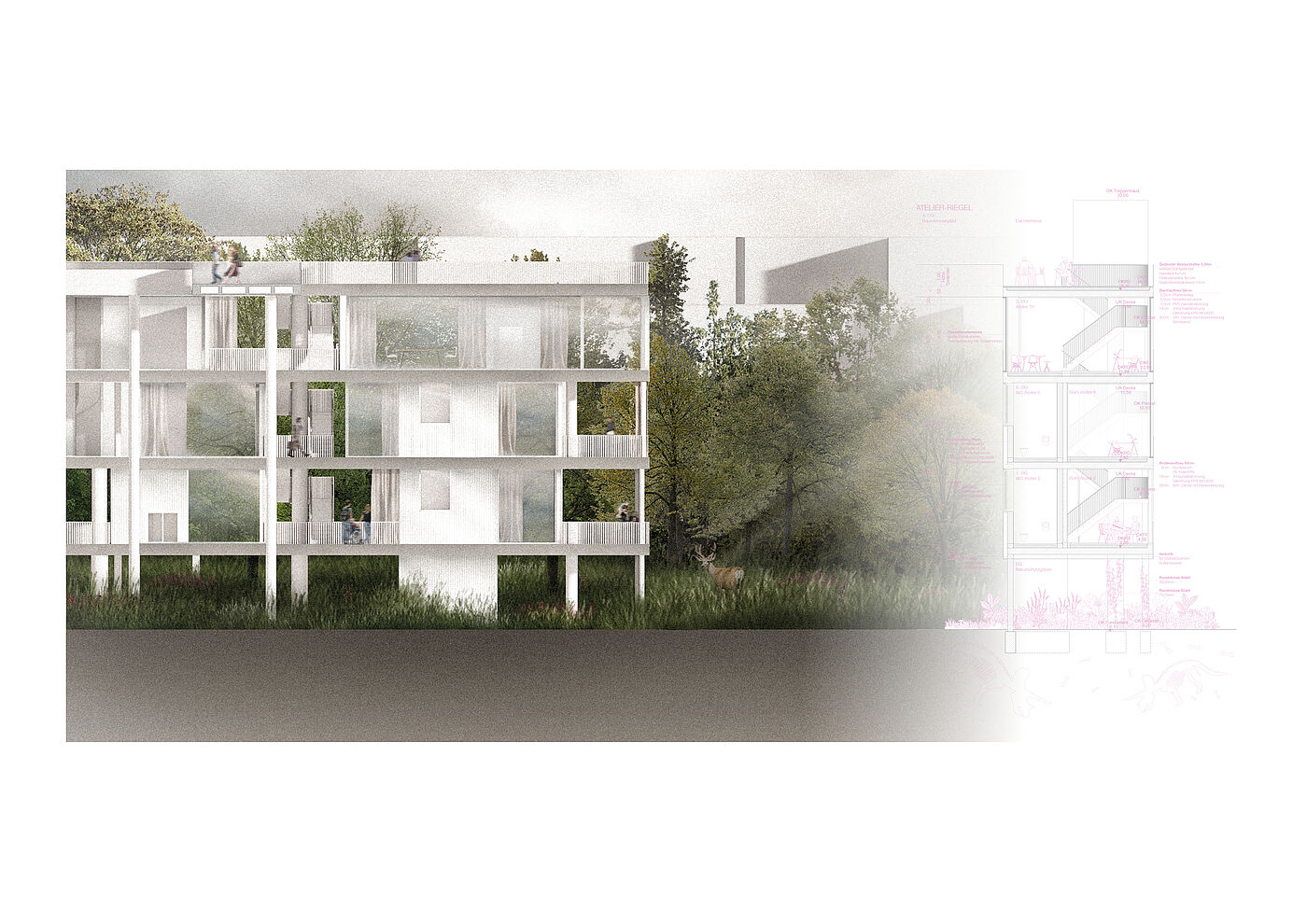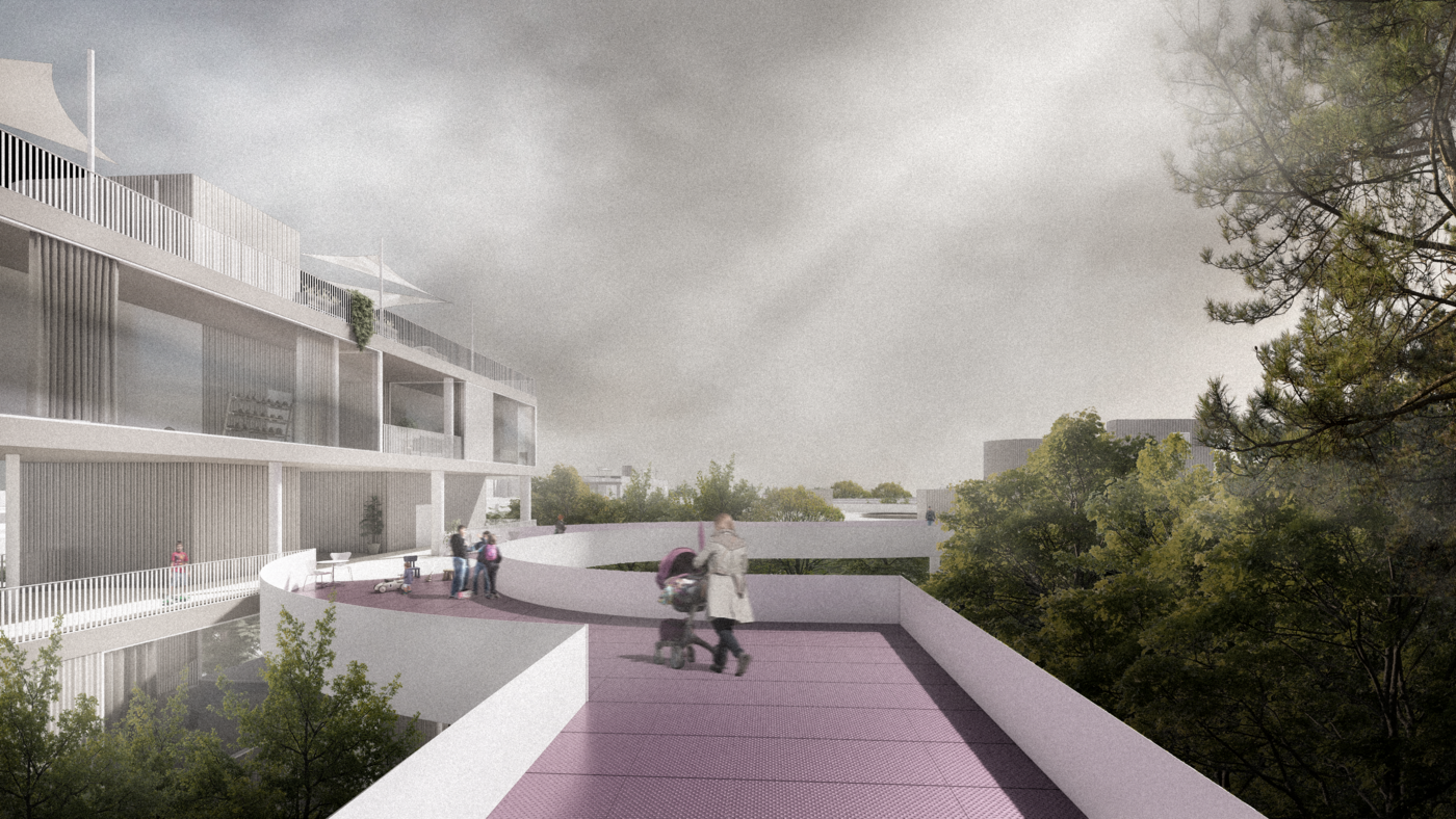Ein Baumkronenpfad verbindet die Riegel, erschließt sie und bietet zugleich eine Aussichtsplattform sowie einen einzigartigen Weg durch die Baumkronen. Er greift die bestehenden Wege des Friedhofs auf und integriert sie behutsam. Die Zuwegung umschließt den Baumbestand mit sanften Rundungen. Das Konzept einer „invertierten Stadt“ sieht Zugänge von den oberen Geschossen vor, während das Erdreich als Naturschutzgebiet ausgewiesen wird. Zugänge an Ost- und Westseite werden durch Zäune begrenzt, die Neugier wecken, aber Einblicke in die Natur ermöglichen. So entsteht ein harmonisches Zusammenspiel von Architektur und Natur, das den Ort respektvoll weiterentwickelt.
