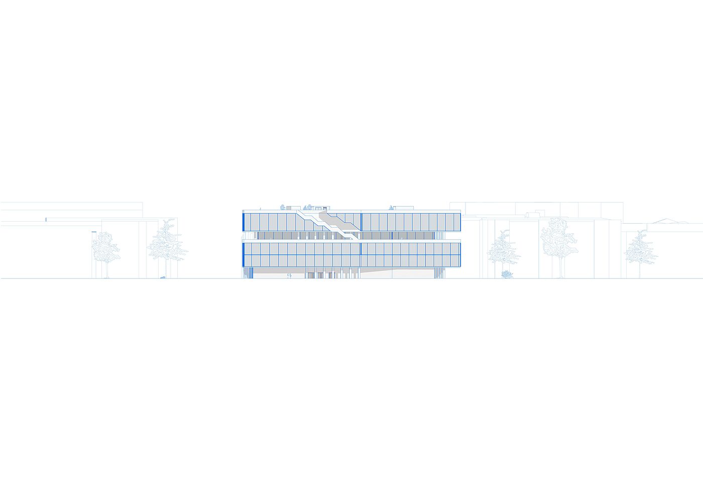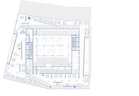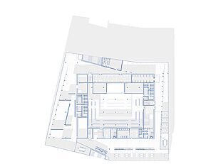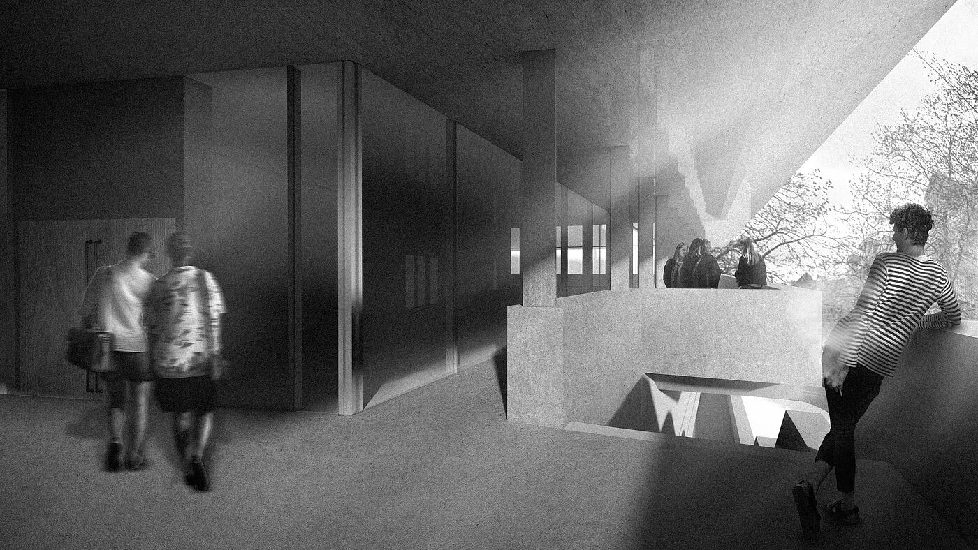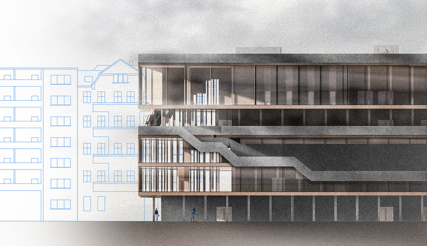 wird der urbane Verkehr auf das Gebäude geleitet. Die Erschließung und die damit einhergehende Durchwegung durch/an verschiedenen Nutzungen/vorbei schafft innerhalb, sowie außerhalb Treffpunkte verschiedener Interessengruppen. So wird programmatisch eine Schnittstelle für diverse Zielgruppen geschaffen. Die Schichtung macht die Prioritäten der Geschosse sichtbar. Die Bedeutung der bestehenden Bebauung soll berücksichtigt werden, da sie prägend für den Ort ist. So werden qualitätsreiche Teile des Bestandes konzeptionell im Neubau umgesetzt.