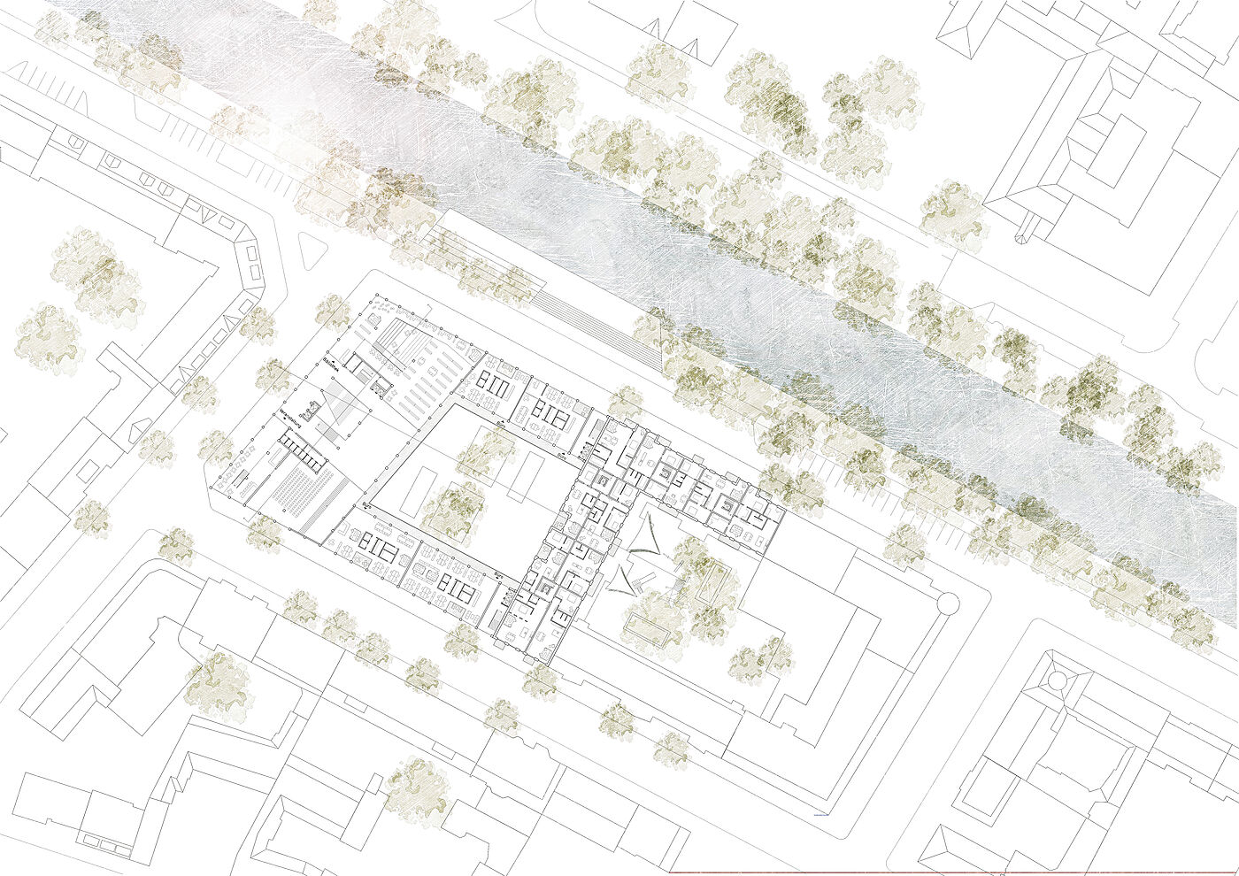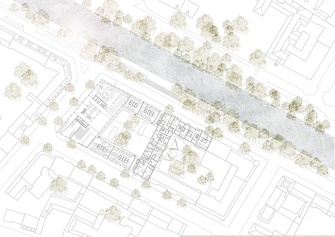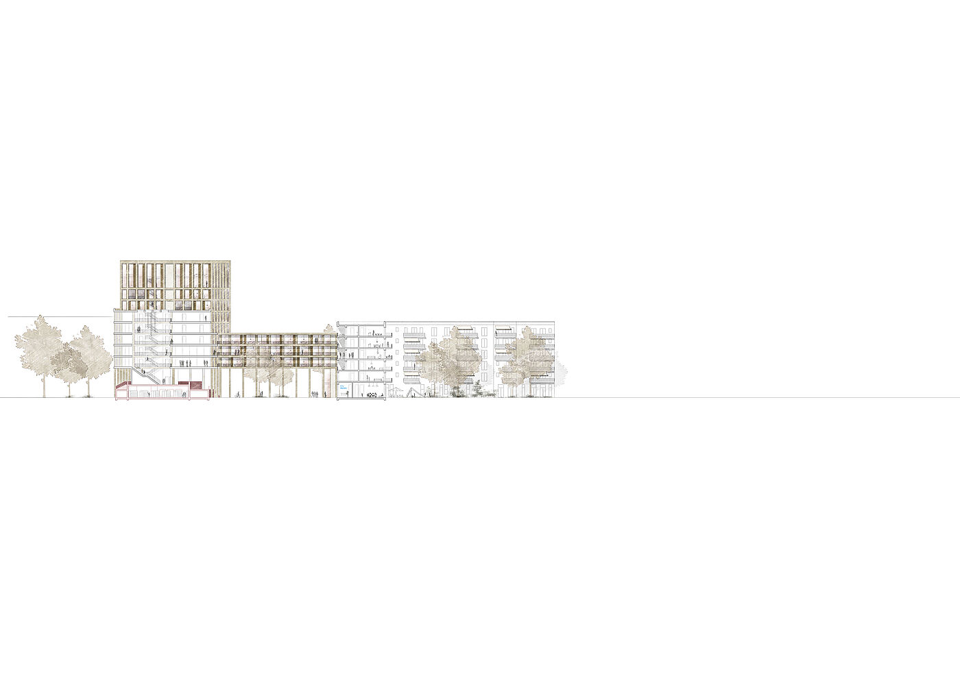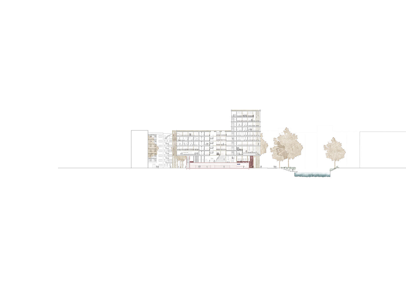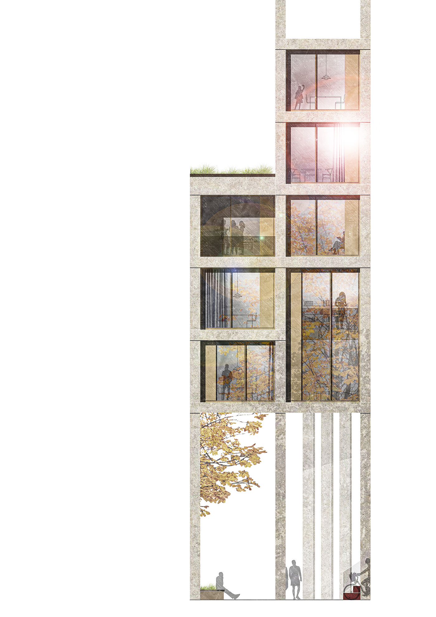 Dieser Entwurf in Berlin Neukölln forderte den Umgang mit Bestand und Neubau. Die vorherige Situation des Grundstückes war städtebaulich eher unpassend für die typische Blockrandbebauung des Stadtteiles. Die neuen Baukörper bilden zwei Höfe aus, welche sich in den Nutzungen unterscheiden. Durch eine gute Einbindung des Supermarkt-Gebäudes ist es gelungen, einen neuen Ort für Kultur, Arbeit und Wohnen zu schaffen, welcher die Menschen verbindet. Die markante Fassade und der Hochpunkt sorgen dafür, dass das neue Gebäude von vielen Richtungen aus sichtbar ist und von den Bewohnern der Stadt gut besucht wird und zu einem Herzstück der Umgebung wird.