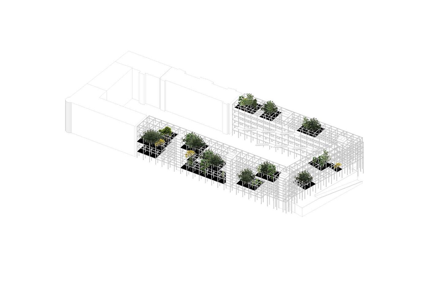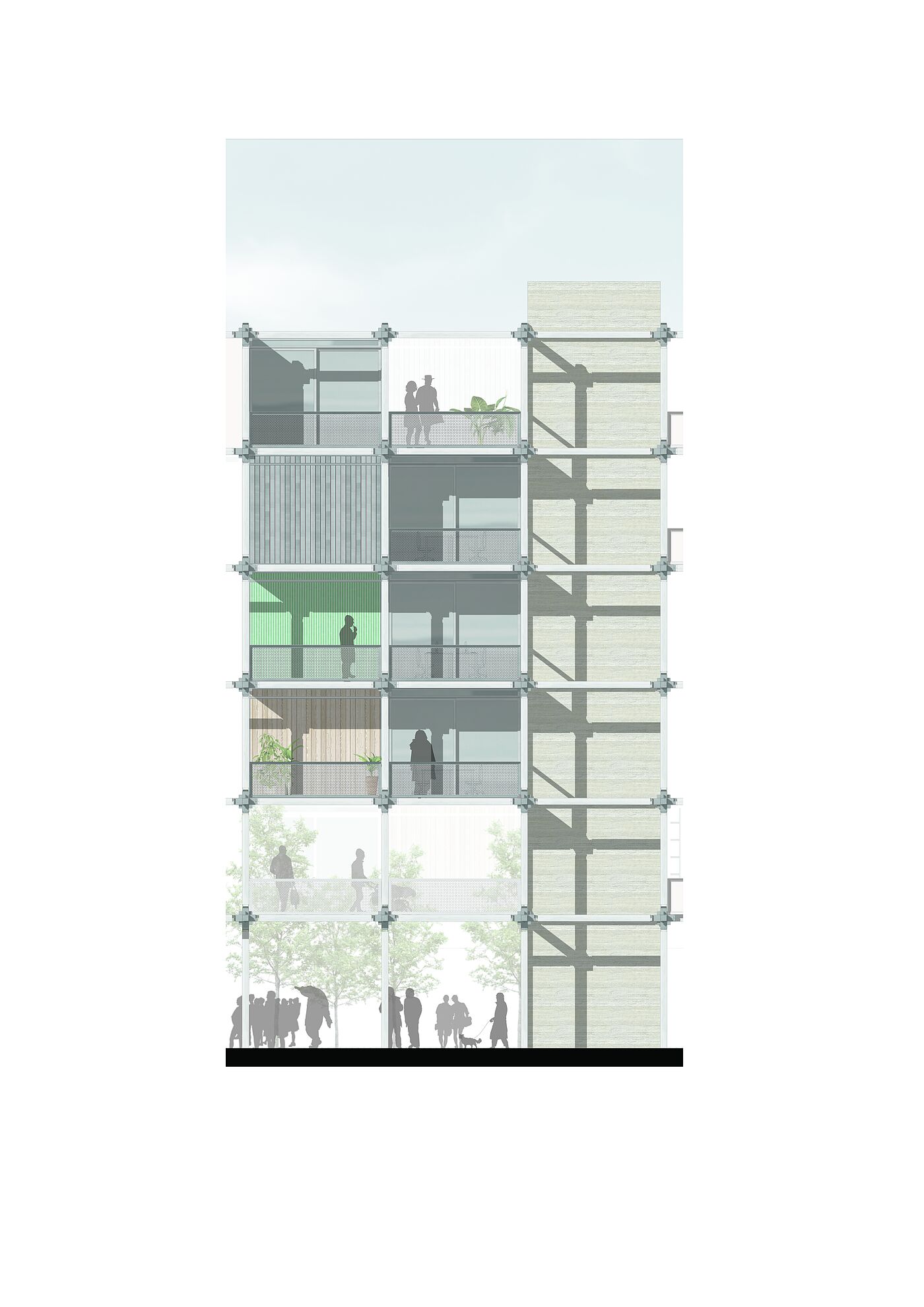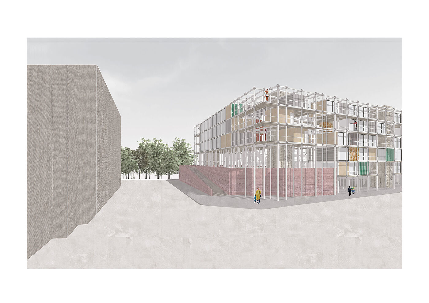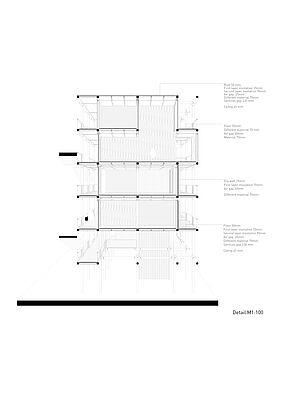 Die "Urban Matrix" ist eine flexible Struktur, die von der zyklischen Natur unserer Stadtlandschaft inspiriert ist, in der Gebäude entstehen, ihren Zweck erfüllen und schließlich neuen Entwicklungen Platz machen. Das Gebäude stellt diesen Zyklus jedoch neu dar und wird zu einem dynamischen Objekt, das sich mit den Bedürfnissen der Gemeinschaft weiterentwickelt. Während seines gesamten Lebenszyklus folgt das Gebäude den Regeln der Reduktion, der Wiederverwendung und des Recyclings. Während des Baus werden gebrauchte Materialien wiederverwendet, um ausrangierten Elementen früherer Strukturen neues Leben einzuhauchen. Dies trägt zu einer Kreislaufwirtschaft bei, in der Ressourcen geschont werden und erzeugt zugleich einen hohen Grad an Identifikation mit der dadurch entstehenden Materialisierung von Raum.