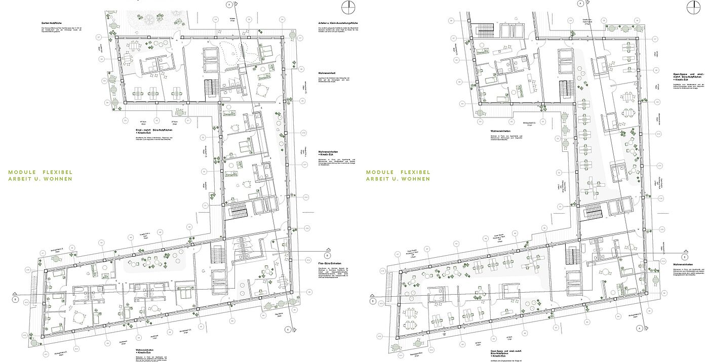 Die gemischte Nutzung des Areals erzeugt dabei verschiedene Spannungsfelder im Stadt- und Freiraum mit unterschiedlichen Intensitäten und Dichten. Basierend auf diesen zentralen Themen gewährleistet darüber hinaus ein hochflexibler Aufbau modularer Systeme in den einzelnen Gebäuden im Grundriss eine hohe Anpassungsfähigkeit in der Funktionalität. Die Erschließungskerne sorgen für eine Trennung der Bereiche und für eine Privatsphäre, zugleich sind die Module kombinierbar und somit auch austauschbar. Eine spätere Fremdnutzung oder Umorientierung ist flexibel möglich, gerade durch die Trennung und den Zusammenhalt der Module. Lediglich die Sockelbereiche sind untereinander identisch in ihrer Bürostruktur und dienen als Pufferzone zwischen öffentlichem und halböffentlichem Raum.