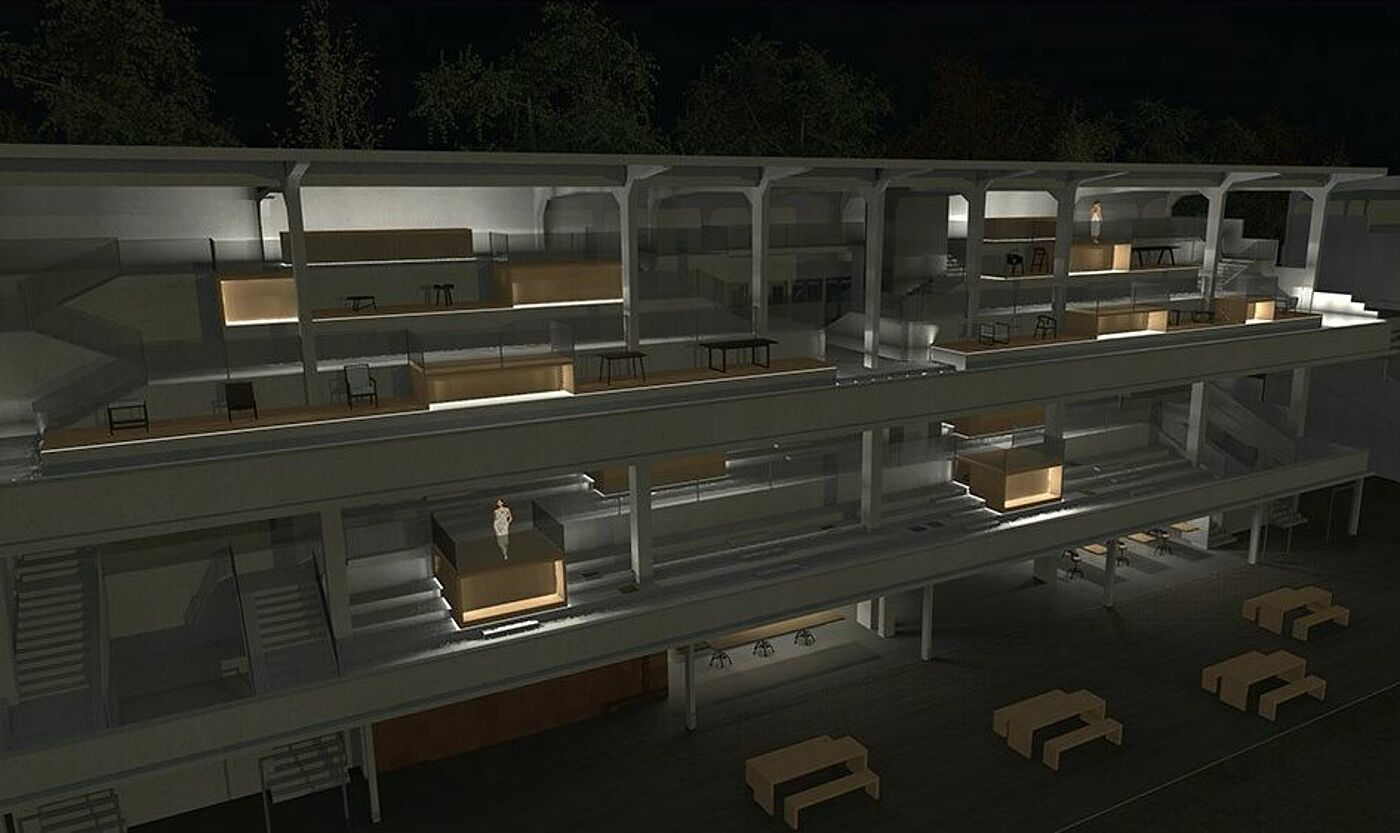 Mit dem Entwurf wird ein neues Konzept für die Tribüne 2, der Wiener Trabrennbahn erstellt. Die Tribüne wird mit neuen Aufgaben und Funktionen revitalisiert und neuerlebbar gemacht. Es wird ein Ort geschaffen, an dem sich Studierende, Kreative, Familien, Berufstätige und Kinder austauschen und entfalten können. Im Erdgeschoss werden Werkstätten angeboten. Auf den Stufen der Tribüne können die neu erschaffenen Produkte in Szene gesetzt werden. Gleichzeitig sind die Treppen ein neuartiger Ort zum Verweilen mit rhythmisch eingestreuten Versorgungsstationen. Die dominante Formensprache, die das Bauwerk kennzeichnet, bleibt erhalten.
