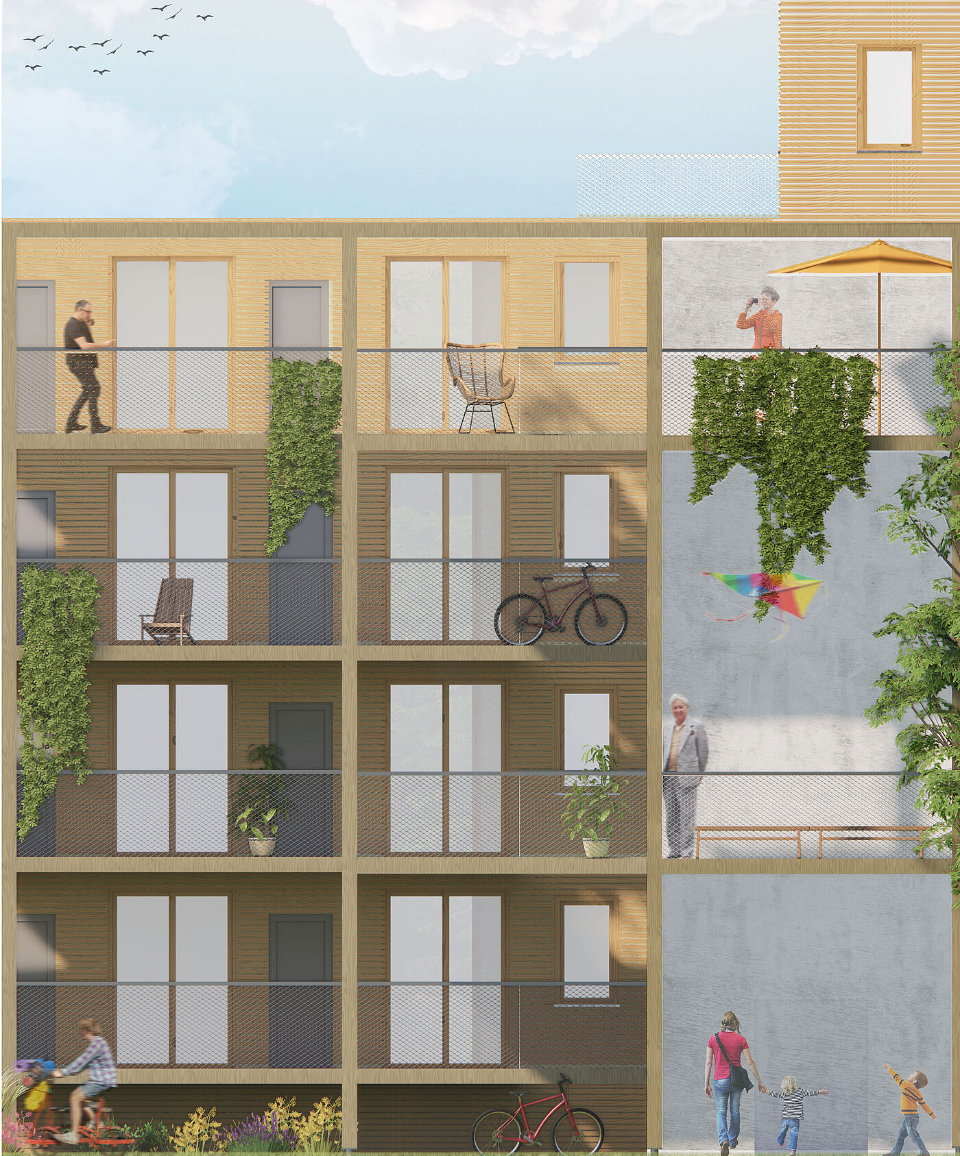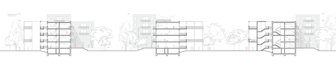 Der Fokus liegt auf dem Dialog und Kontrast zwischen verschiedenen Bereichen sowie der Erforschung der Beziehungen zwischen Raumprogramm und Architektur. Die Integration in den bestehenden Bestand und die spannende Lage innerhalb der vorhandenen Bebauungsstruktur sind ebenfalls wichtige Aspekte. Es werden Konzepte für hybride Gebäude entwickelt, die neben Wohnnutzungen auch eine Mobilitätsstation und ergänzende Angebote enthalten. Das Prinzip des Teilens soll auf allen Ebenen sichtbar werden: von der Struktur der einzelnen Wohnung über gemeinschaftlich genutzte Flächen im Innen- und Außenraum bis