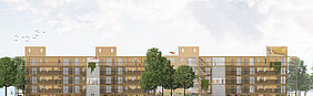 Im Entwurf „Neues Leben 4.0“ geht es um die Modernisierung und Anpassung von Plattenbauten an heutige Anforderungen. Das Projektgebiet, ein Teil der John-Brinckmann-Siedlung in Goldberg, soll durch neue städtebauliche Elemente, wie die Weiterverwendung von Bauteilen, Rückbau und Nachverdichtung