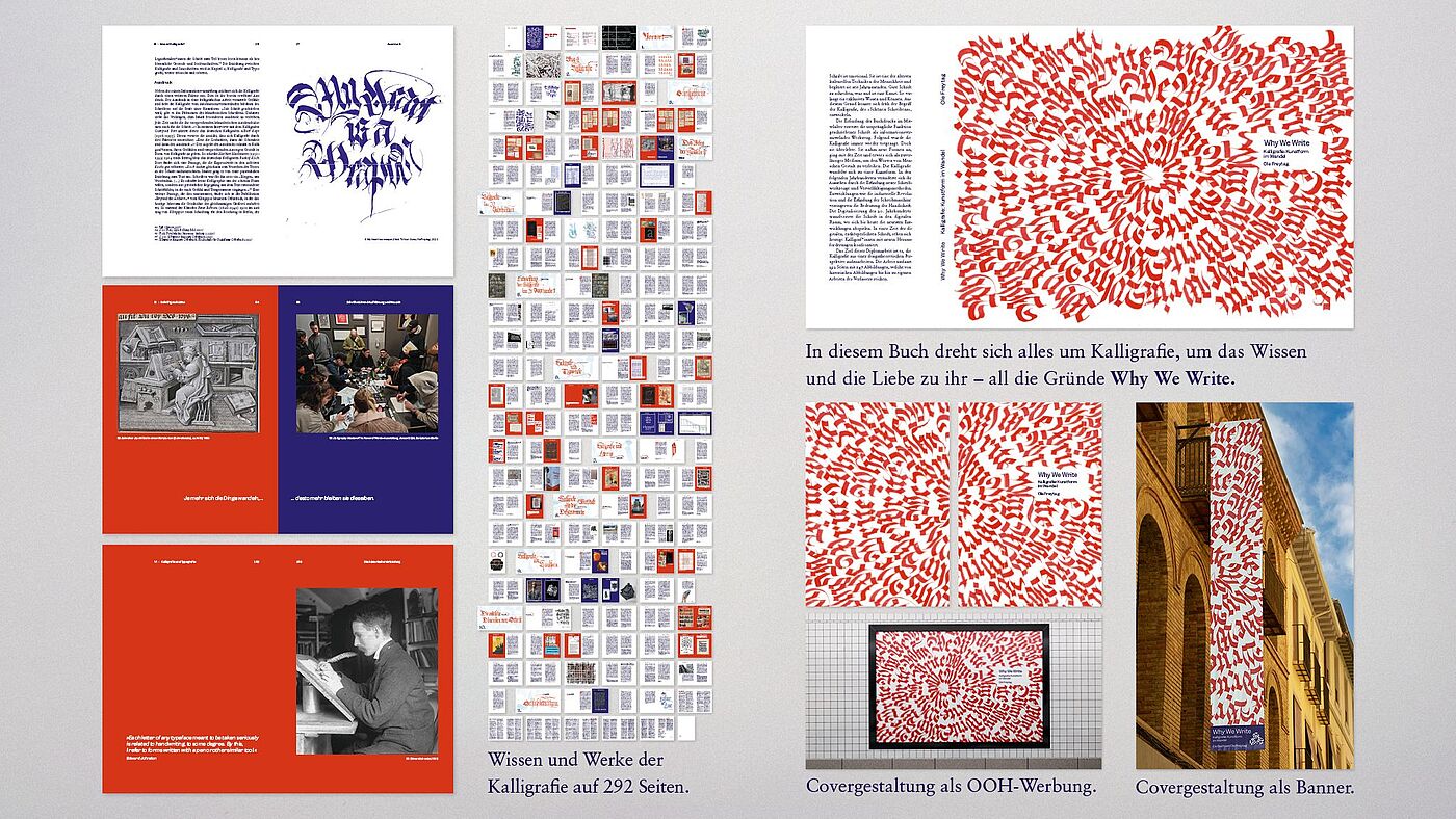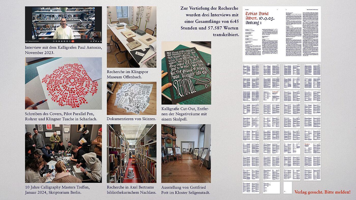 Lösung/Umsetzung: Recherche in Museen und Archiven (Klingspor Museum Offenbach), Nachlässen (Axel Bertram) und Bibliotheken wie der ADK. Besuche und Interviews mit wichtigen Vertretern der Branche (Tobias David Albert, Gottfried Pott, Paul Antonio, …) folgten. Ergänzt um Visuals historischer, aktueller und eigener Werke wurde alles in einem 292-seitigen Buch verdichtet.