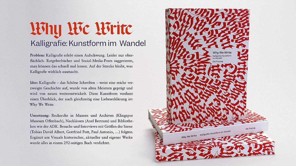 Idee: Kalligrafie – das Schöne Schreiben – weist eine reiche verzweigte Geschichte auf, wurde von alten Meistern geprägt und wird von neuen weiterentwickelt. Diese Kunstform verdient einen Überblick, der auch gleichzeitig eine Liebeserklärung ist: Why We Write.