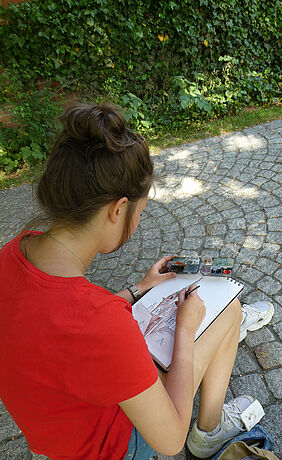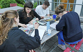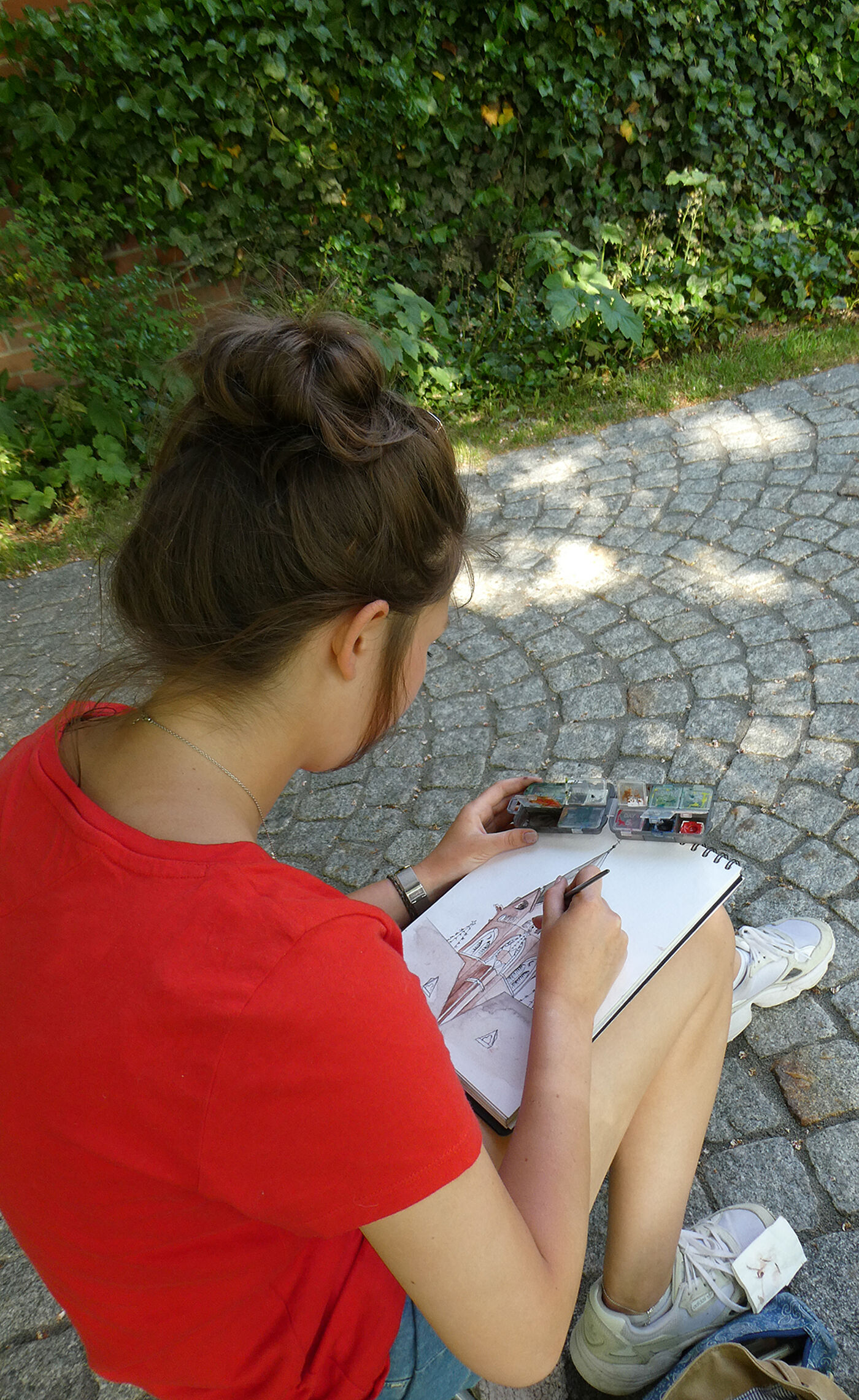 Tobias Trauzettel, der im 1. und 2. Semester unsere KuM-Studierenden in Zeichnen unterrichtet und Hanka Polkehn haben zusammen mit unseren Teilnehmer:innen die Woche genutzt, in der Ruhe und Abgeschiedenheit konzentriert zu arbeiten.