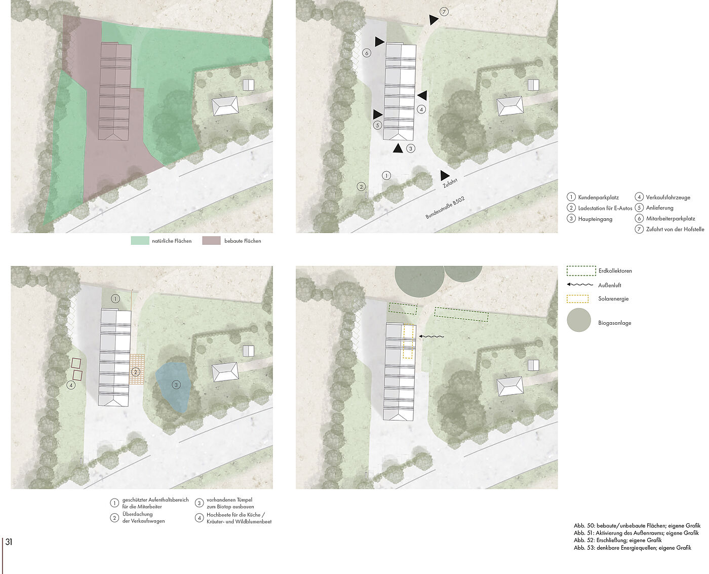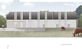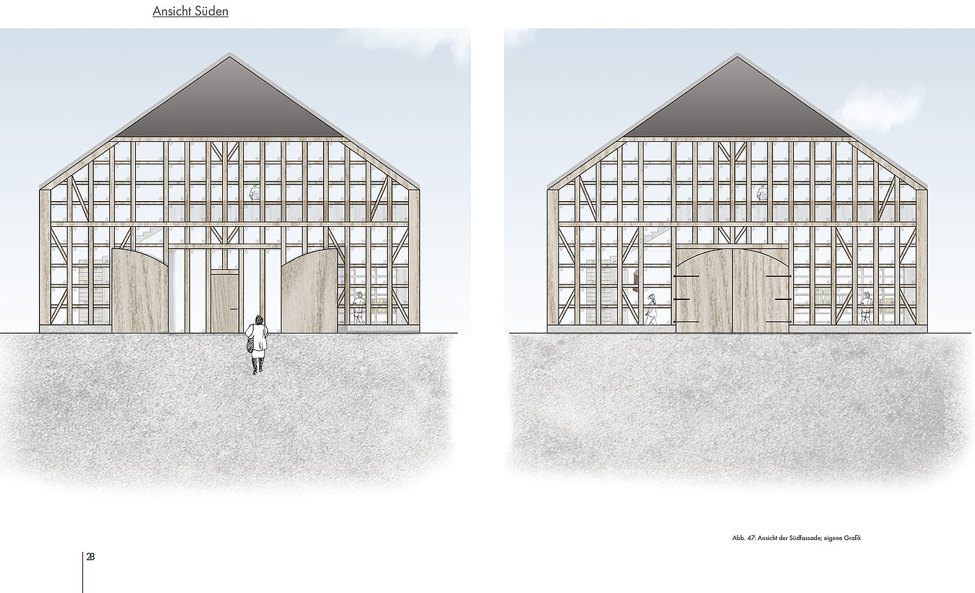 Frau Untiedt hat für ihre Arbeit wertvolle Erkenntnisse über die Literaturrecherche und Analyse von Referenzprojekten gewonnen, in der der Anspruch einer nachhaltigen, transparenten Tierverwertung mit einem hohen architektonischen Anspruch umgesetzt werden konnte. Gleichsam wurden vielseitige und innovative energetische Konzepte ausgewertet und auf ihre Angemessenheit untersucht. Eine weitere Anforderung der Arbeit bestand darin, einen „transparenten“ Schlachtereibetrieb in den Kontext des bestehenden und historisch gewachsenen Hofes Untiedt und eine ländlich geprägte Siedlung städtebaulich zu integrieren. Eine Untersuchung zu traditionellen Bauweisen in Anknüpfung an die bestehenden Gebäude des Hofes hat Frau Untiedt im Rahmen der Arbeit ebenfalls geführt.