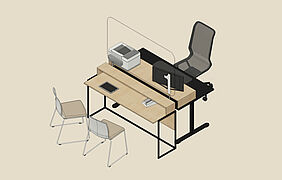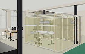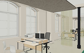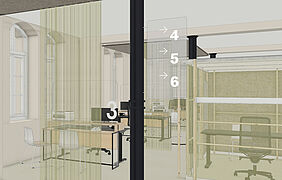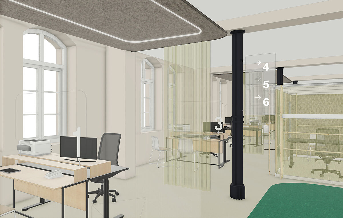 Im Bürgerbüro wurde eine Raumaufteilung gewählt, die den Besucher*innen eine klare Orientierung ermöglicht. Die Infotheke befindet sich zentral im Eingangsbereich und ist direkt sichtbar. Durch eine gezielte Anordnung der Möblierungselemente kann viel Tageslicht in den Innenraum einströmen, was zu einer angenehmen Raumatmosphäre beiträgt. In den Arbeitsbereichen kommen schallisolierte Kuben und akustisch wirksame Vorhänge zum Einsatz, die eine ruhige Arbeitsumgebung bieten und eine ungestörte Kommunikation ermöglichen.