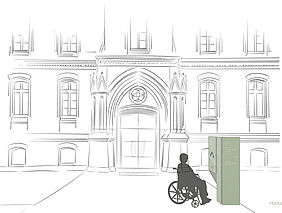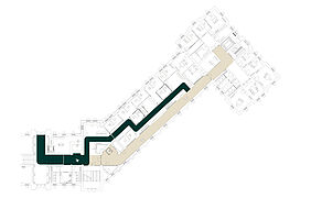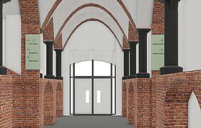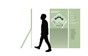 Das Standesamt wurde so gestaltet, dass es sowohl für die Verwaltungsaufgaben als auch für die Durchführung von standesamtlichen Zeremonien geeignet ist. Die Raumaufteilung, die einen zentralen Flur und mehrere Büros umfasst, bietet Flexibilität. Glaswände lassen Tageslicht in die Räume, während Vorhänge für die notwendige Privatsphäre während der Zeremonien sorgen. Das Wegeleitsystem im Neuen Rathaus berücksichtigt die Orientierung der Besucher*innen im Gebäude. Durch Außenstehlen, farblich kontrastierte Bodenmarkierungen und projizierte Informationen im Innenraum wird der Weg durch die verschiedenen Bereiche klar und einfach ersichtlich. Für Menschen mit Einschränkungen werden Hinweiselemente und Piktogramme eingeführt, die eine nahezu barrierefreie Nutzung des Gebäudes ermöglichen.