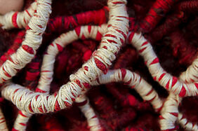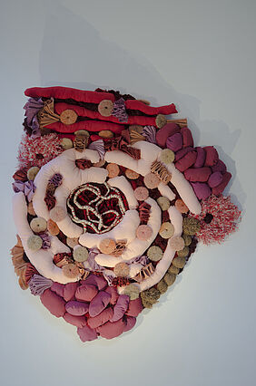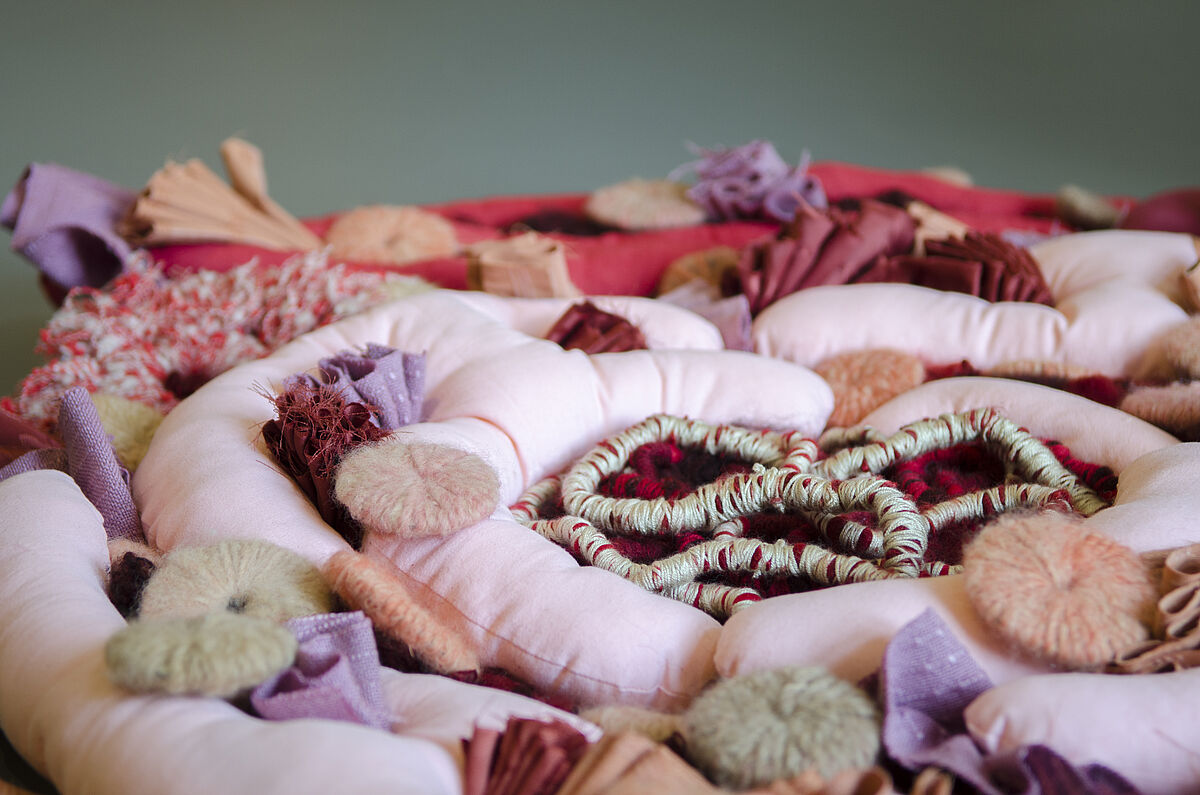 In der Auseinandersetzung mit Textilresten entstand hier der Prototyp eines Objekts, welches versucht diesen ein zweites Leben zu geben. Die Farbliche Kategorisierung einer privaten Stoffansammlung war Ausgang für die Wahl des Motivs einer tierischen Zelle. Durch die spielerische Abstraktion der Organellen der Eukaryoten, entstanden verschiedene Formen, die zur Interpretation einladen. Die leichte Mixtur an Fasern von gefärbter Rohwolle bis zu Polyamiden unterstützt die taktile Varianz.