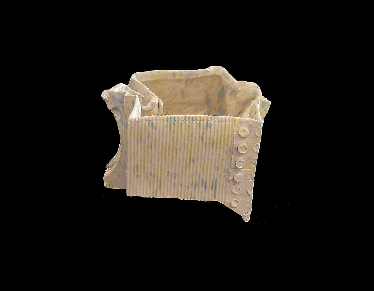 Drei keramische Formen wurden aus einer Reihe von zufällig ausgewählten negativen Gipsformen zusammengestellt - mit dem Ziel, eine nicht vorhersehbare Form zu erreichen. Diese wurden mittels Steinzeug gegossen und mit Glasur, bestehend aus den Primärfarben Rot, Gelb, Blau behandelt, die willkürlich auf die Formen gesprenkelt wurde. Anschließend wurden die Formen gebrannt.