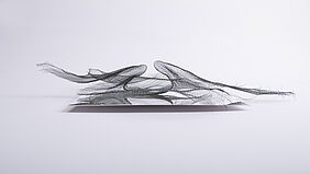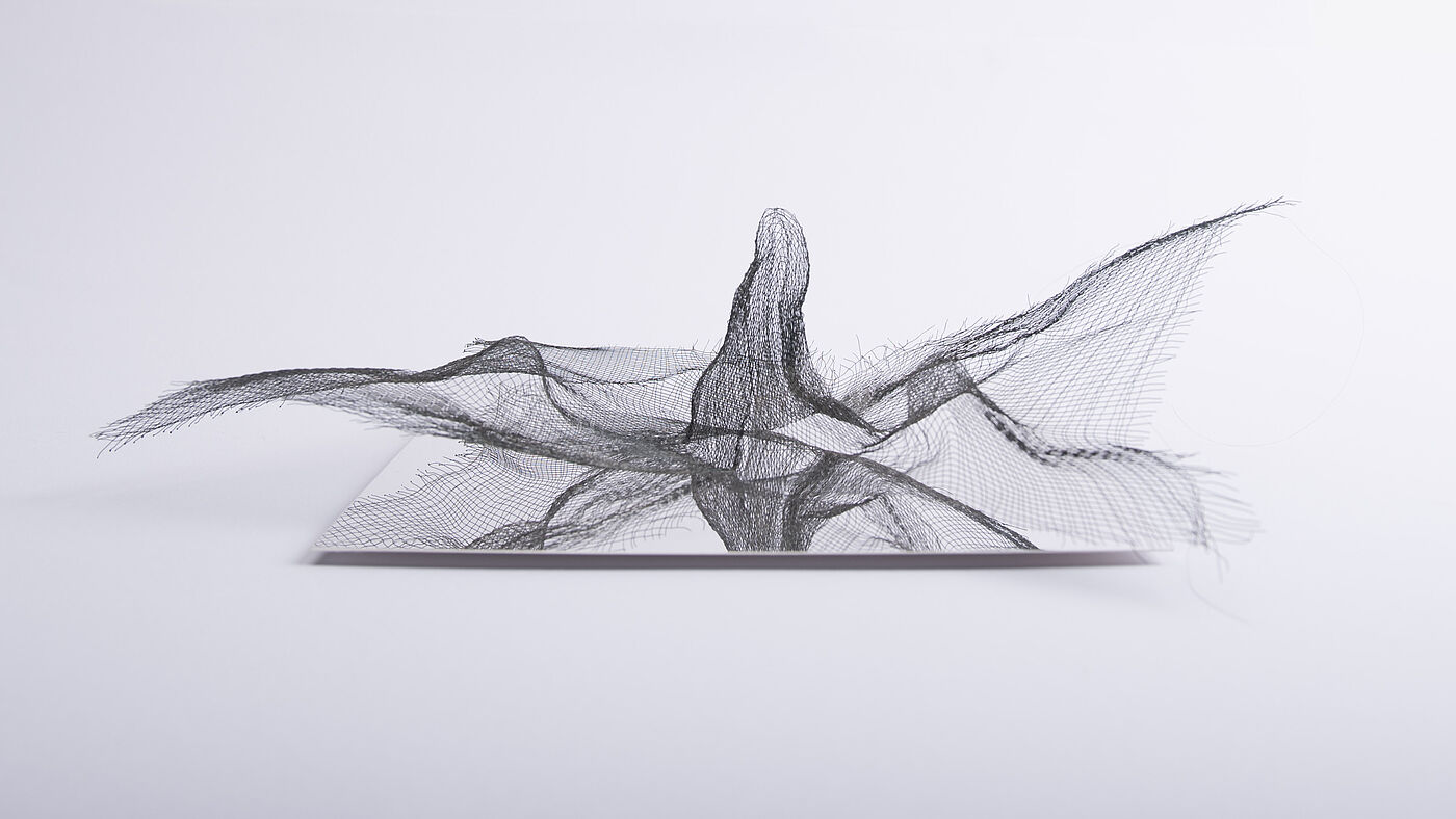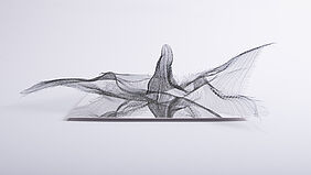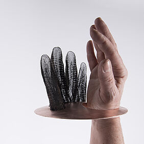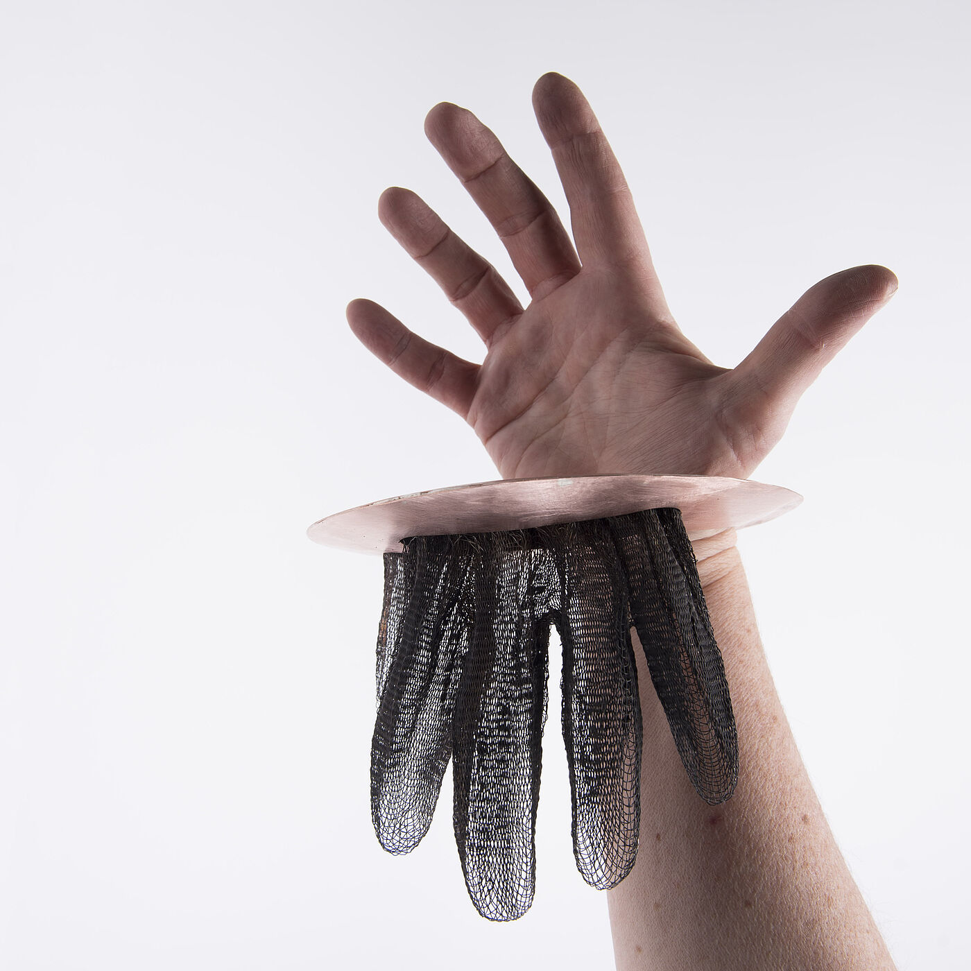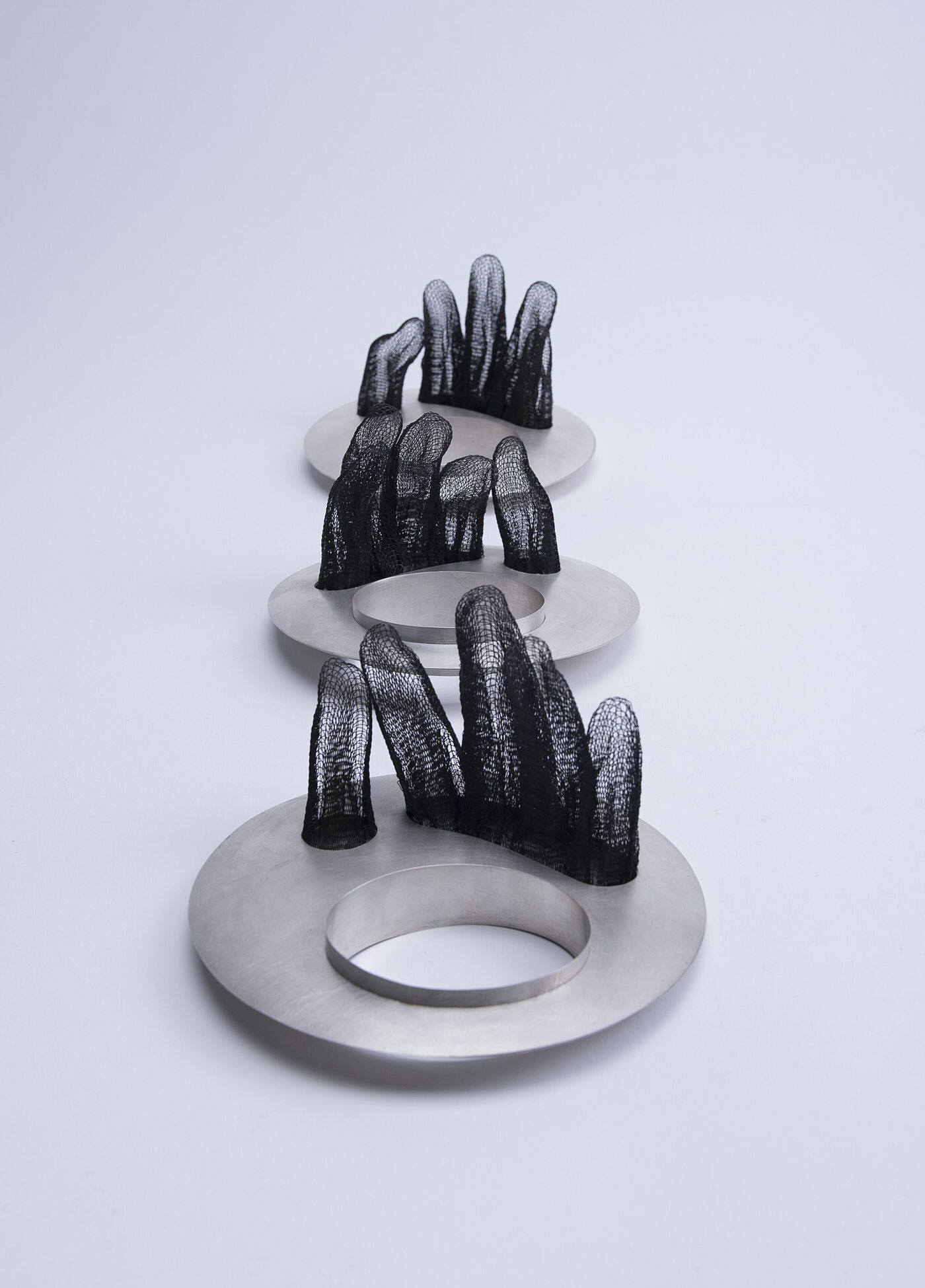Im Prozess der Abformungen menschlicher Körperteile kristallisiert sich heraus, dass die Formen von Händen und Fingern und deren Umsetzung in feinmaschigen Stahldraht ihrem Thema am nächsten kommen. Es entstehen zwei Serien mit Hand – und Fingerfragmenten: